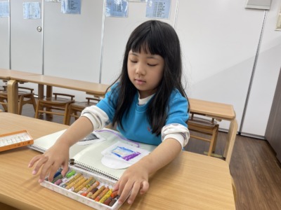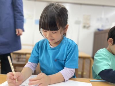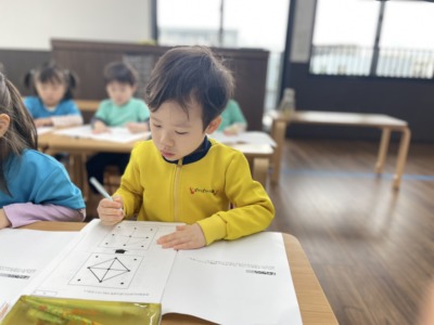 机に座ると、子どもたちは鉛筆をしっかりと持ち、真剣な表情でワークに取り組み始めました。「せんせー!みて!できた!」「次のページやっていい?」と嬉しそうに見せてくれる子どももいれば、「これどうやってやるの?」と質問する子どももいます。保育者はすぐに答えを伝えるのではなく、「ここをよく見てみようか」「どこまで分かったかな?」とヒントを出しながら一緒に考えていきます。すると子どもたちは「あ!わかった!こうかな?」と自分で考えながら答えを導き出し、「できた!」と満面の笑顔で教えてくれます。