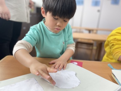 その後は制作活動の時間になりました。以前の制作で子どもたちは手袋を作っていましたが、今日はその手袋を製作帳に貼り、作品として仕上げていきました。先生が「今日は作った手袋を製作帳に貼って完成させます」と伝えると、「どこに貼ろうかな」「ここがいいかな」と子どもたちは楽しそうに考えながら準備を始めました。