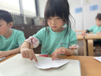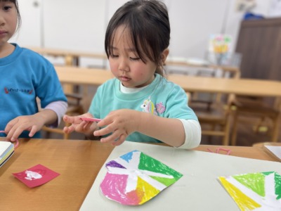 同じ手袋の制作でも、子どもによって描くものや表現が違うところがとても面白く、子どもたちの個性を感じる時間となりました。「先生見て!できたよ!」「かわいいでしょ?」と作品を見せてくれる子どもたちの表情はとても誇らしげです。友だち同士でも「いいね!」「上手!」と声を掛け合う姿が見られ、温かい雰囲気の中で制作を楽しむことができました。