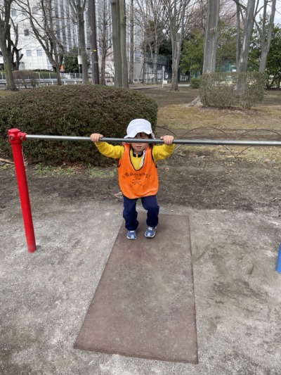 鉄棒では、逆上がりに挑戦する子、ぶら下がって元気いっぱいに揺れる子など、それぞれの身体能力に合わせて、果敢にチャレンジしていました。