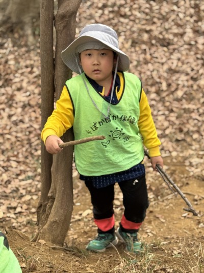 先生と一緒に木の枝で太鼓をたたいたり♬、探したものを先生に見せてくれたり♡