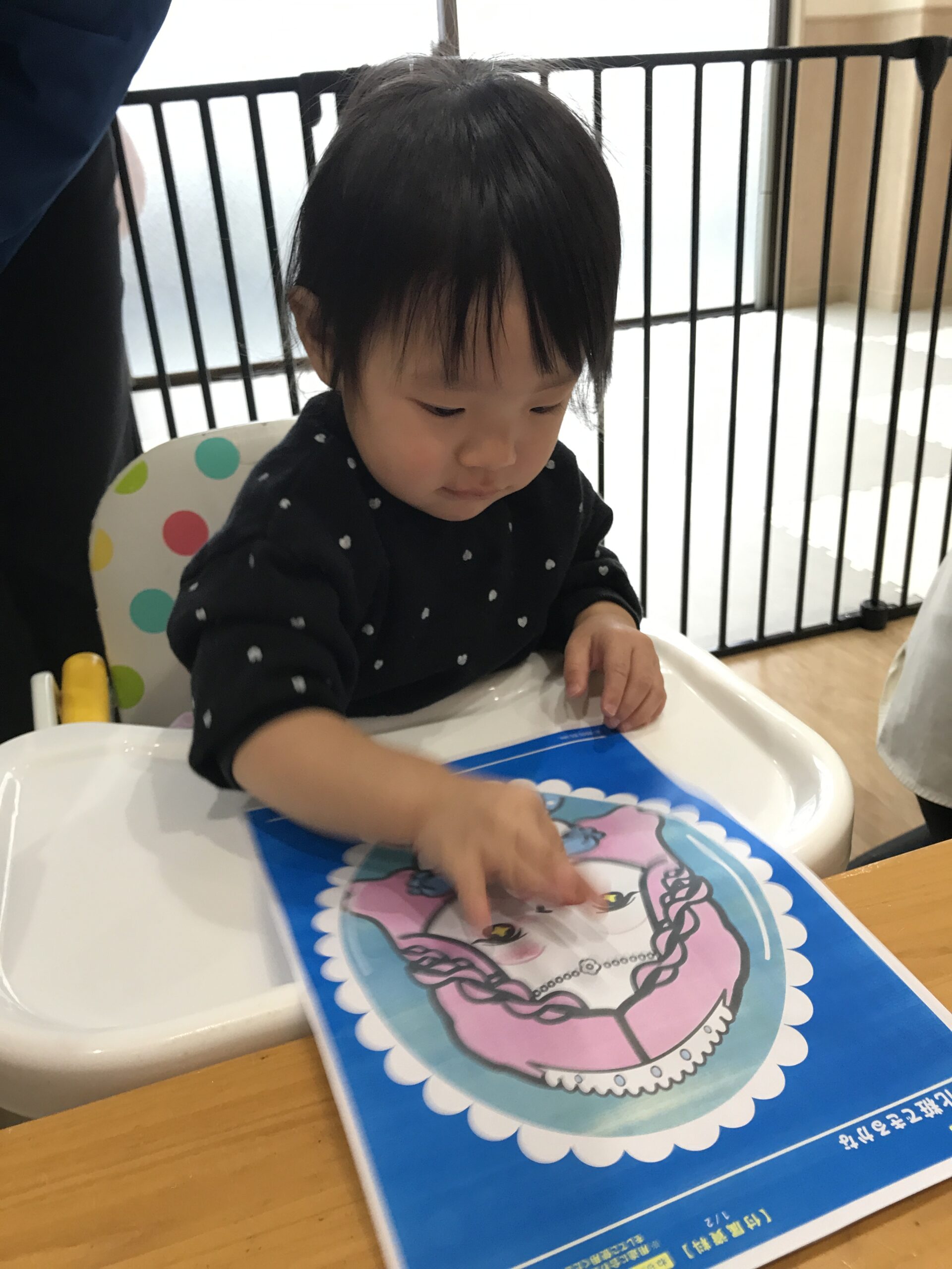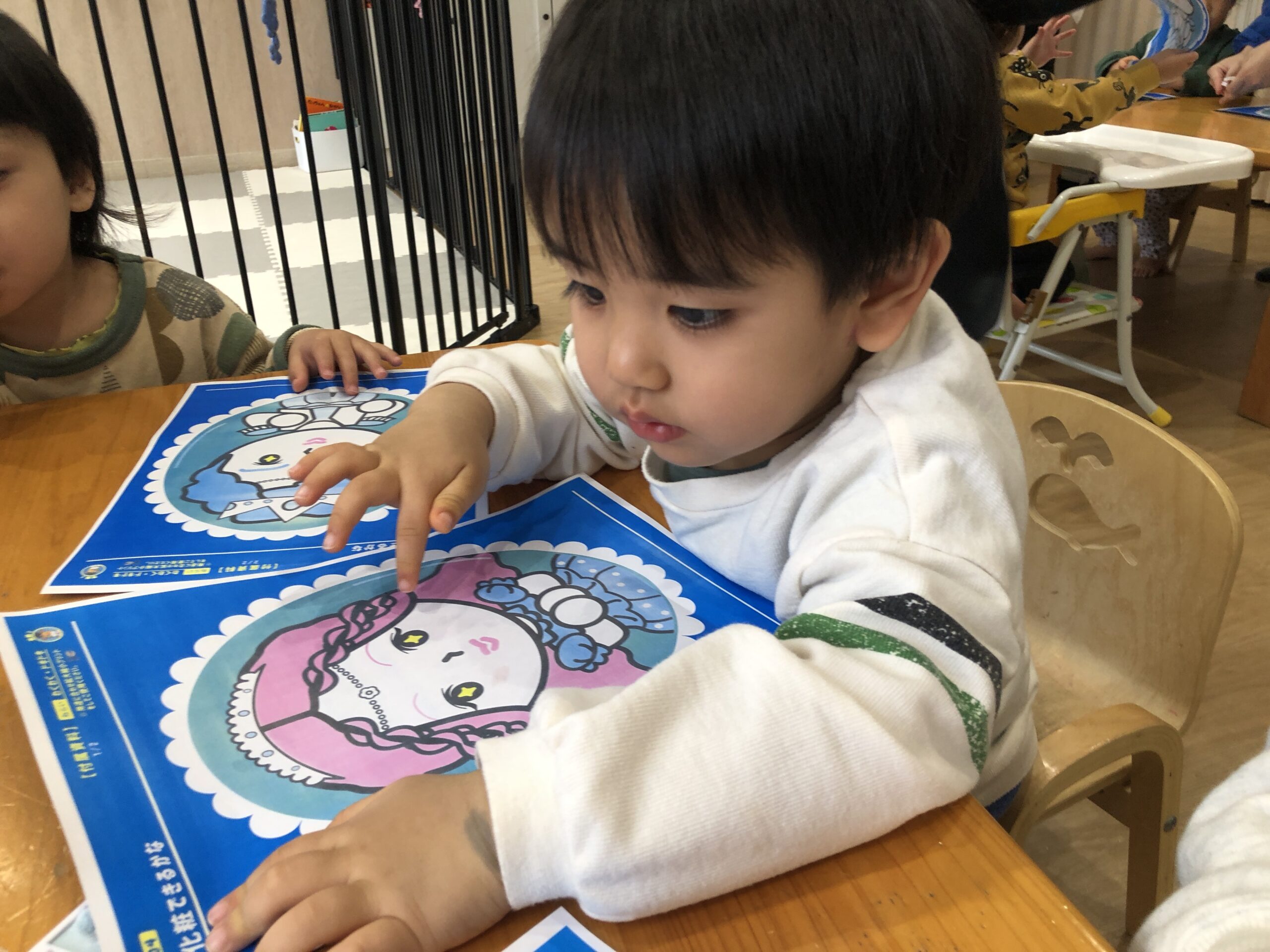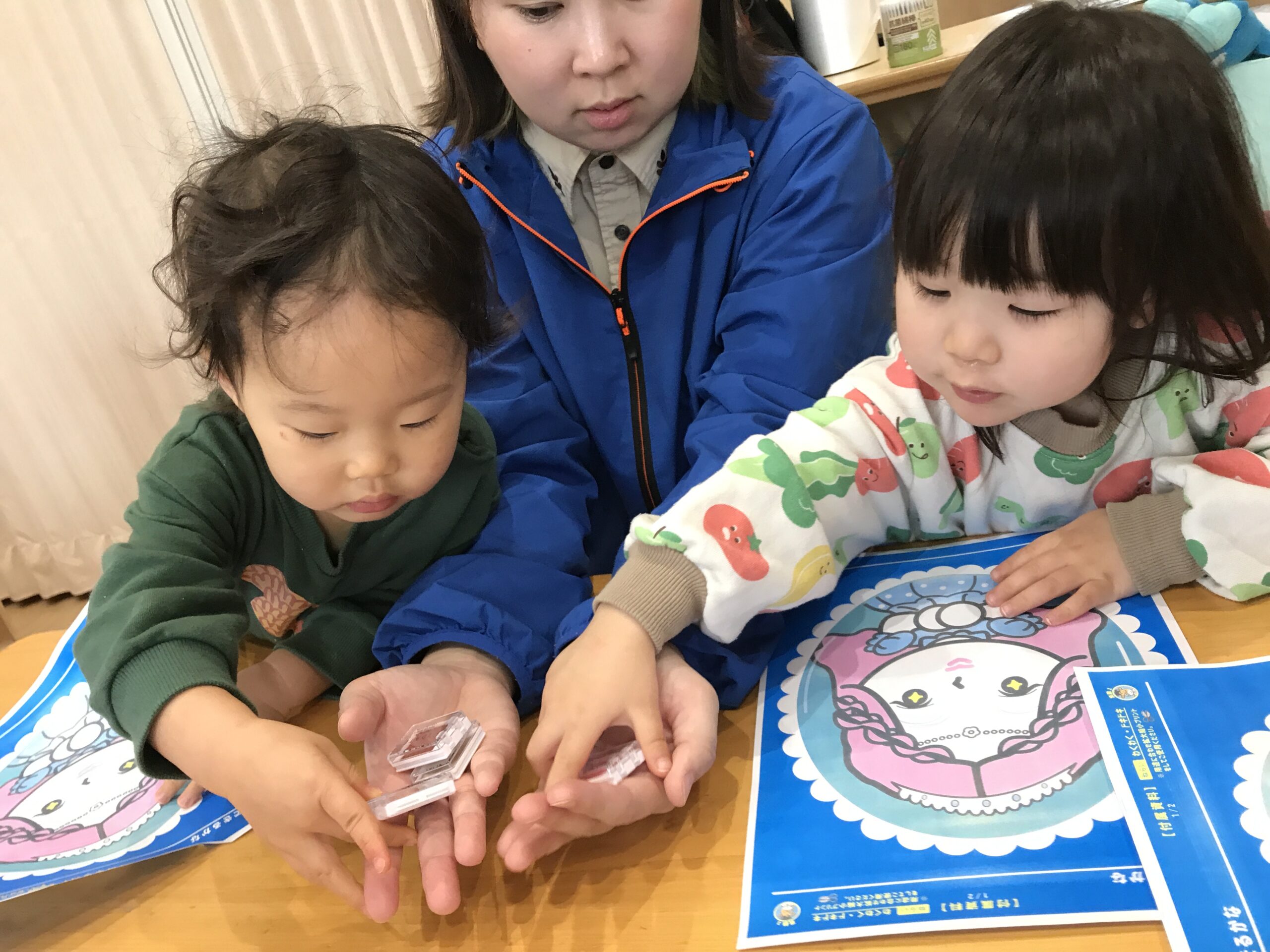 1歳児さん同士で色の名前を言いながら、「色こうかんこしよう♪」と、やりとりする姿も見られました。