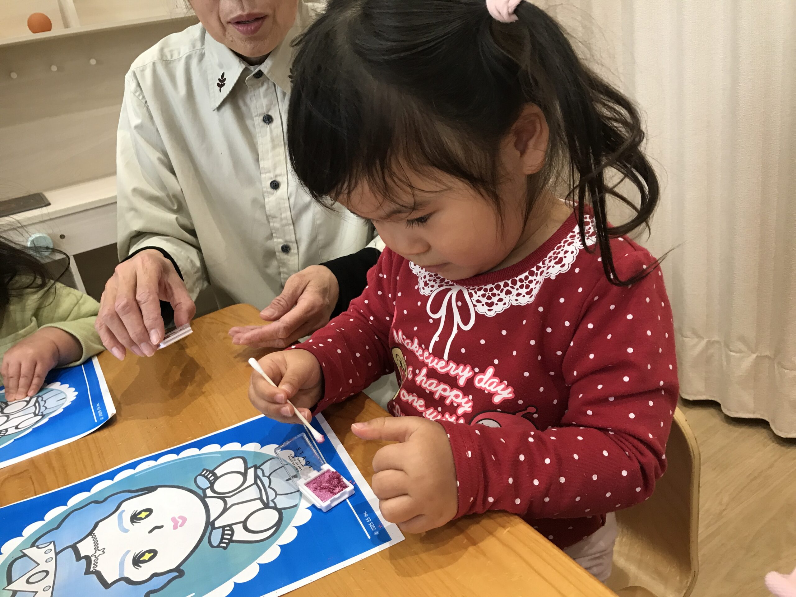 子供たちは慎重に綿棒を持ち、そーっとイラストに触れました。