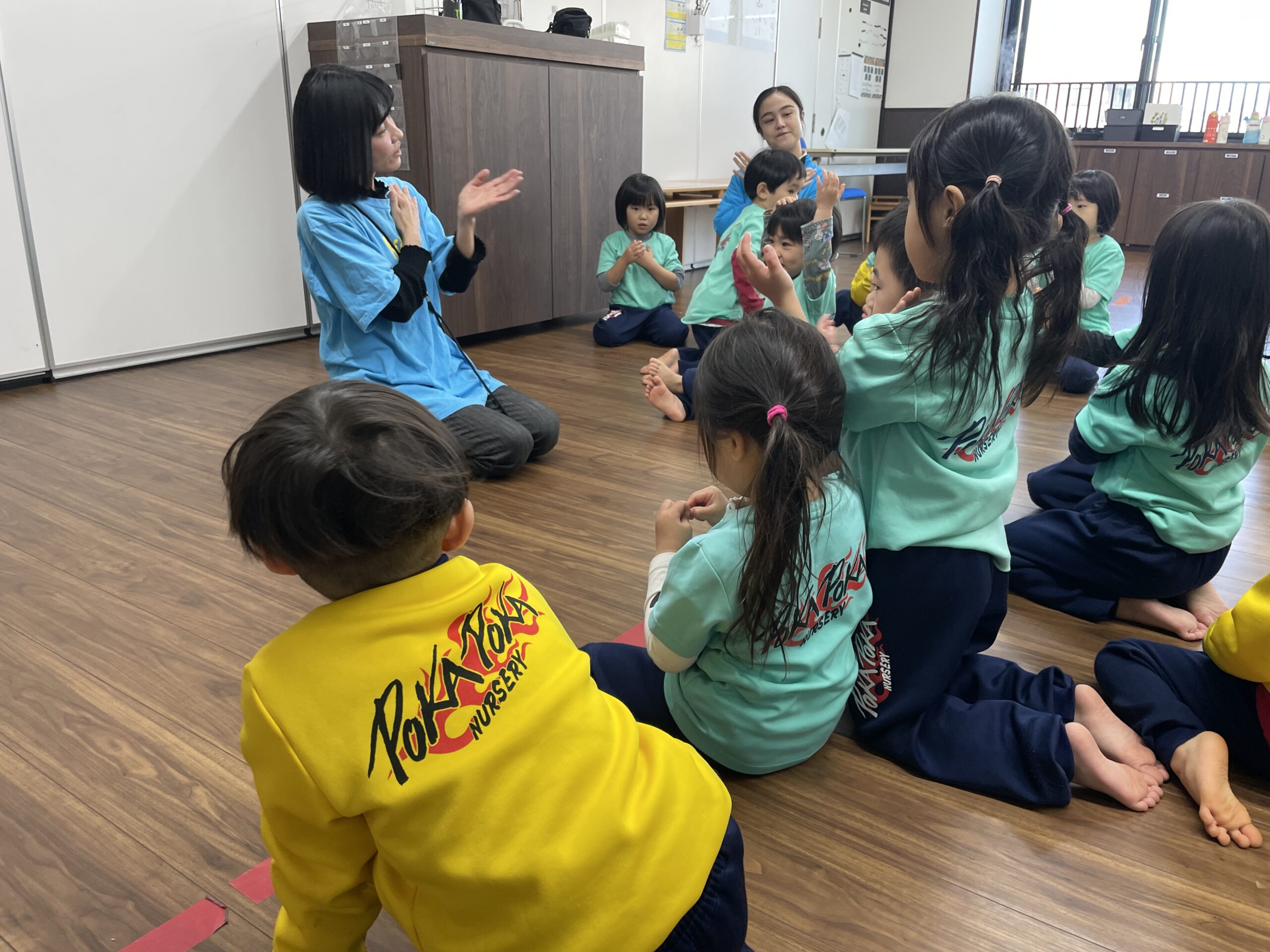 「Hello song!」に合わせて元気よく挨拶を交わし、