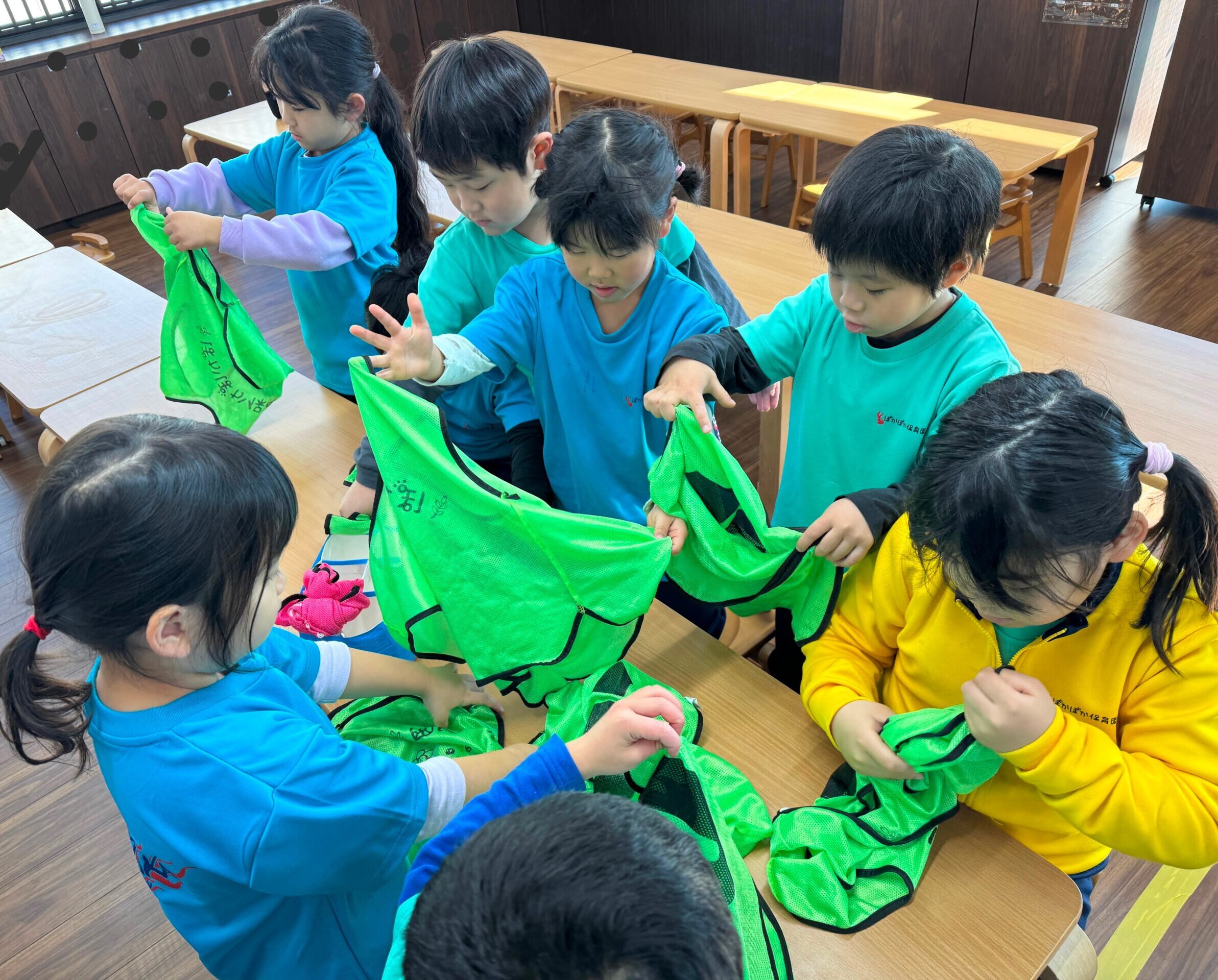 お散歩から帰ってきたら自分たちで、ビブスを畳むことができていました!