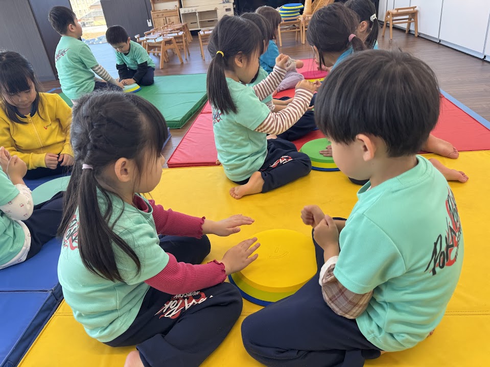 リトミックでは凧あげ、コマ回しなどの伝統的なお正月遊びの動きに加えて、お餅の動きを楽しみました!