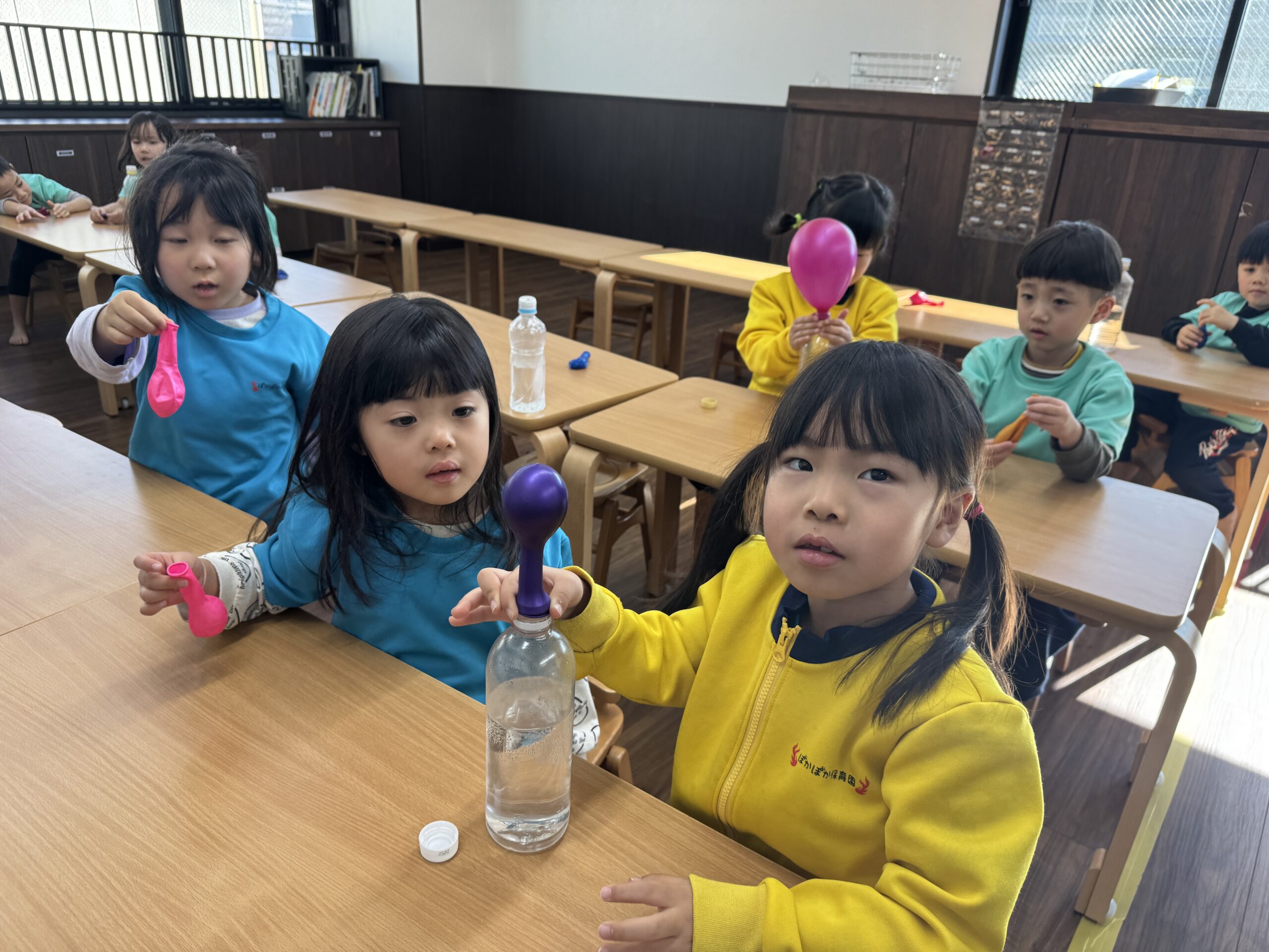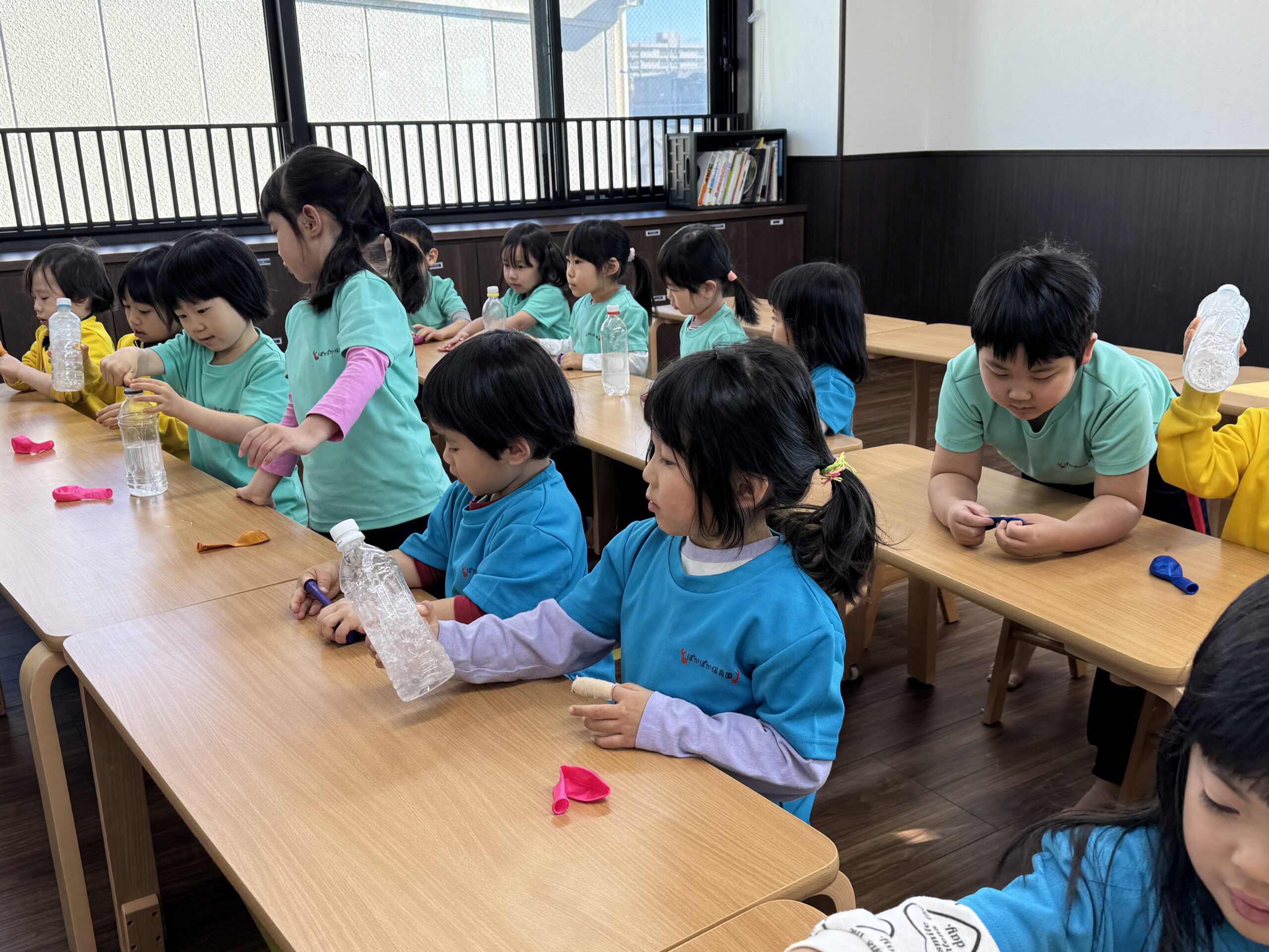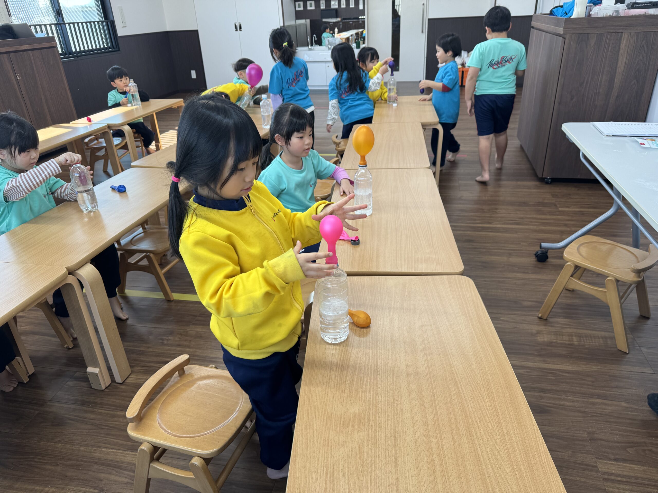 最後に実験の振り返りとしてどうして風船が膨らんだのか、クエン酸と重曹を混ぜると泡が出るのかの考察をみんなでしました!「十三の中に泡が入ってるんだよ!」「泡が入れるときに混ざるのかな?」等様々な考えが出てきてとても面白かったです!