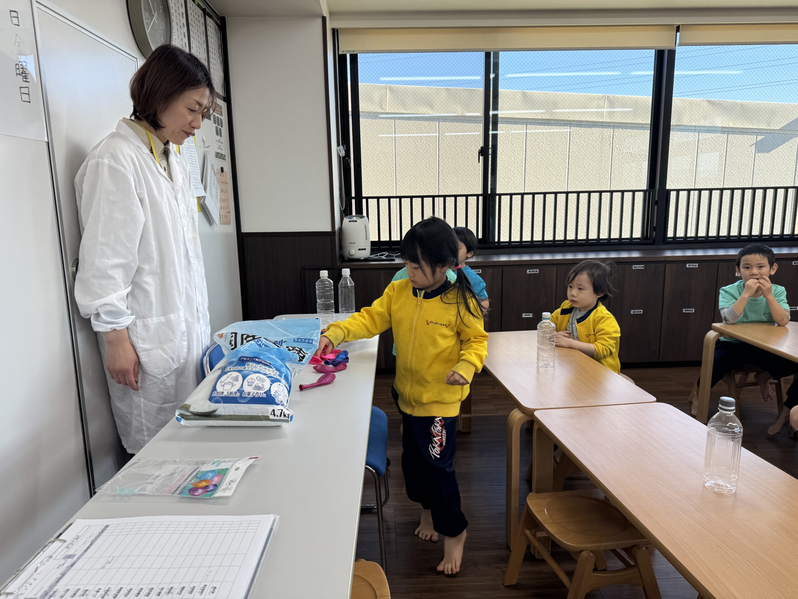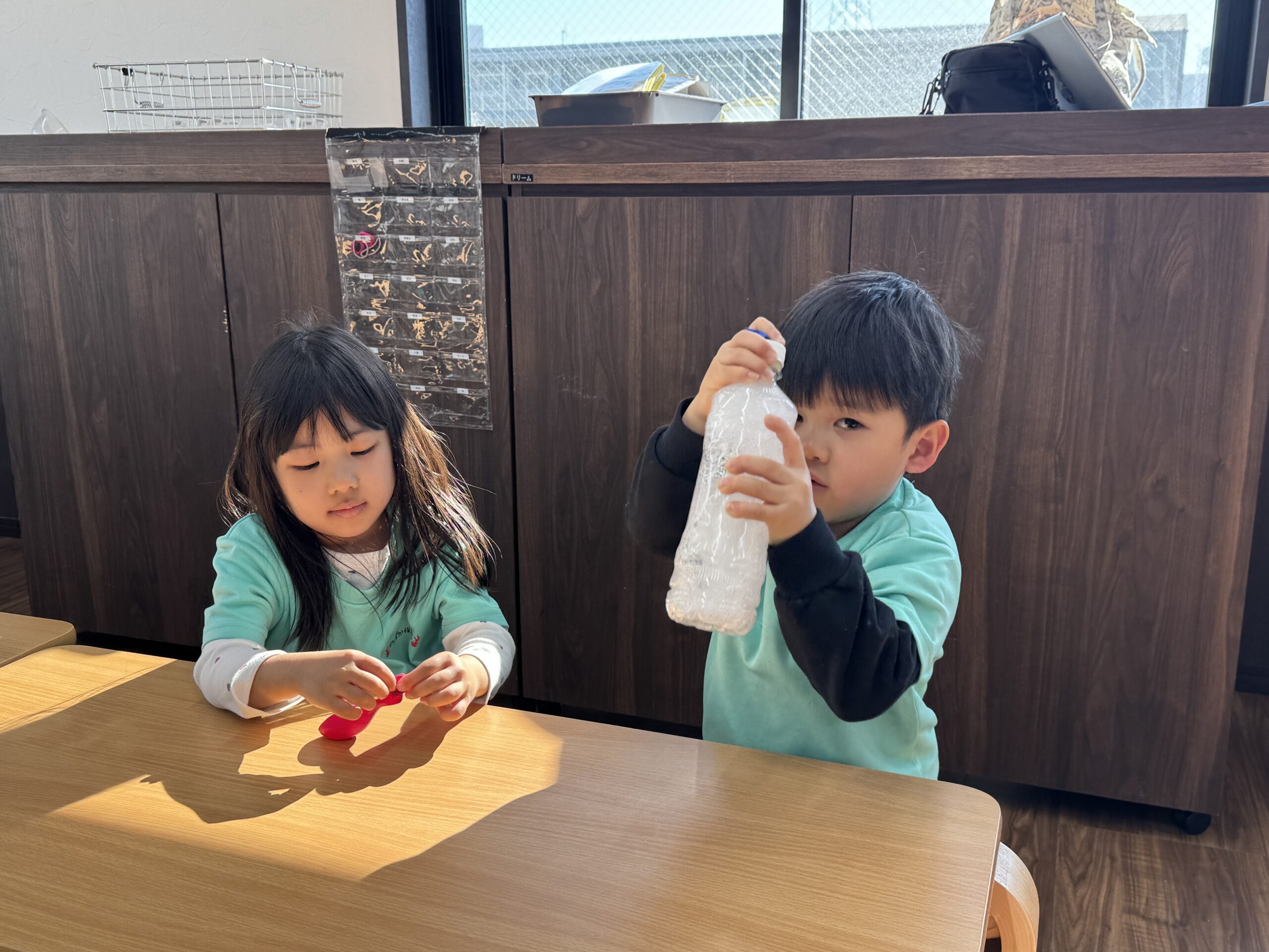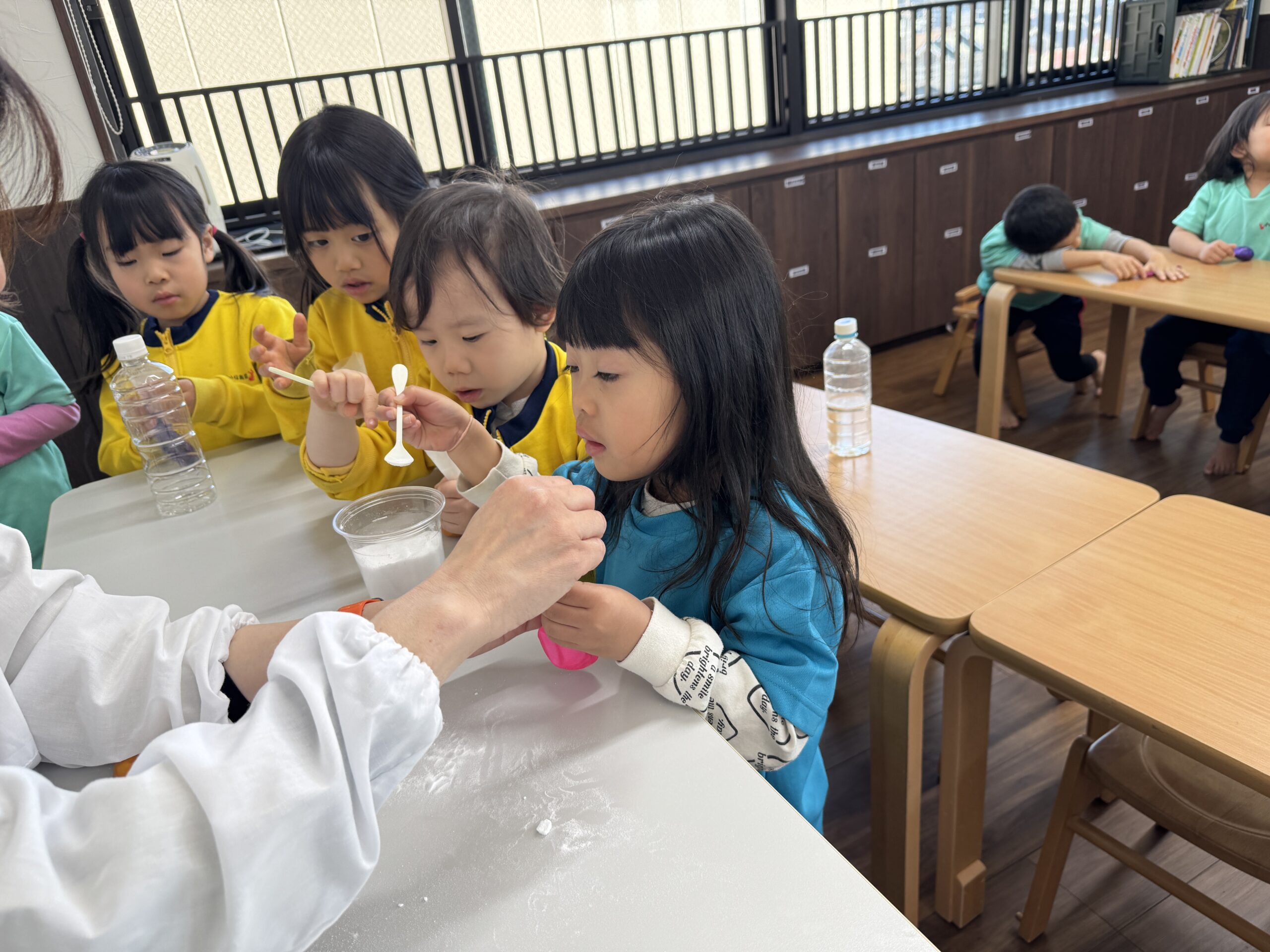 最後に実験の振り返りとしてどうして風船が膨らんだのか、クエン酸と重曹を混ぜると泡が出るのかの考察をみんなでしました!「十三の中に泡が入ってるんだよ!」「泡が入れるときに混ざるのかな?」等様々な考えが出てきてとても面白かったです!