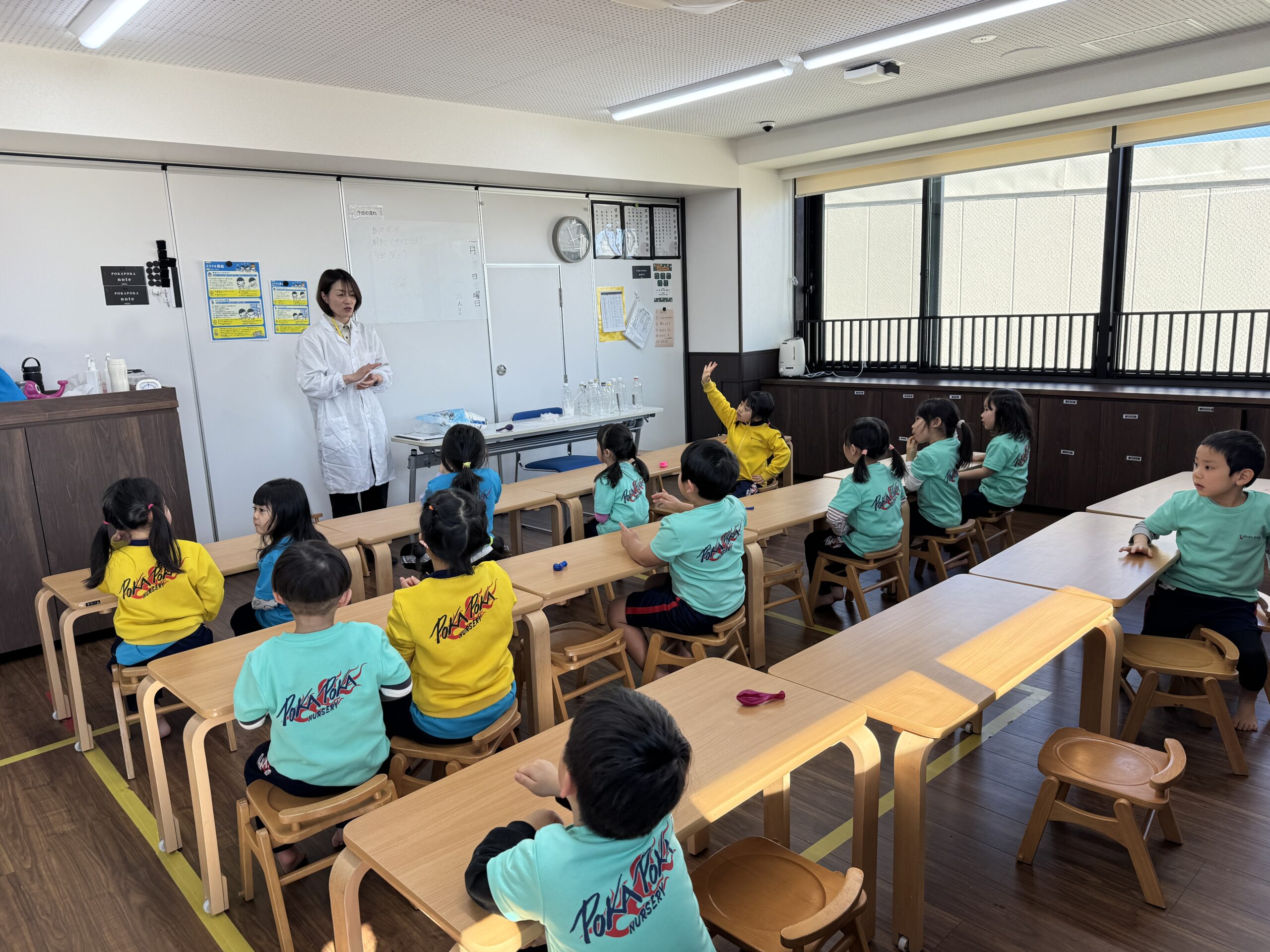 まずは実験内容についてお話を聞きます。すでにワクワクがとまらない子供たち♡