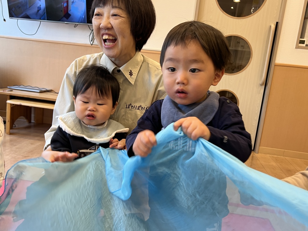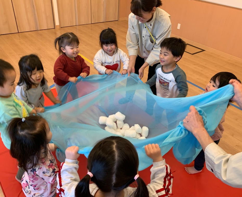 大判スカーフの空に雪玉を乗せて、みんなでそうっと揺らします。