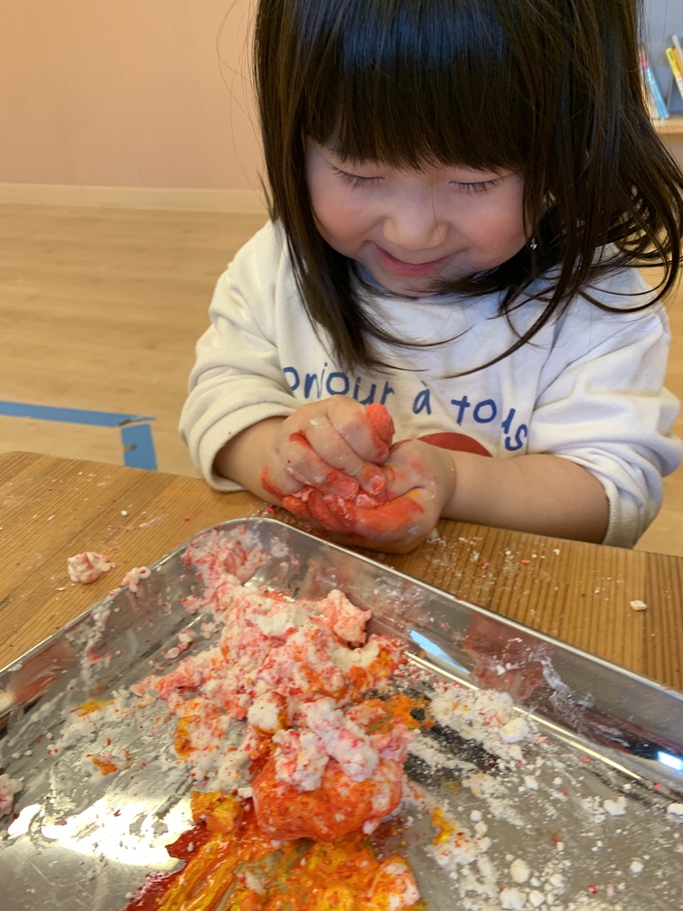 手にも色が付いて、その手に興味津々で「見て!」と先生や友だちに見せ合っていましたよ。