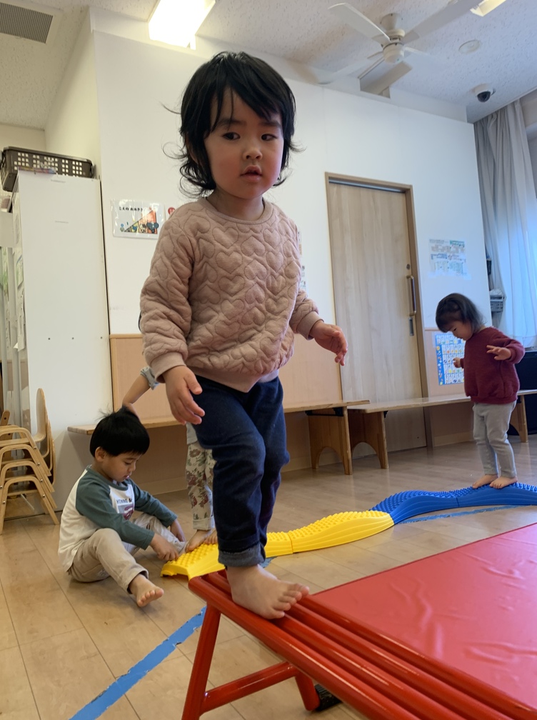 子どもたちは真剣な表情で、平均台の上を一本橋のようにゆっくりと歩いていきます。