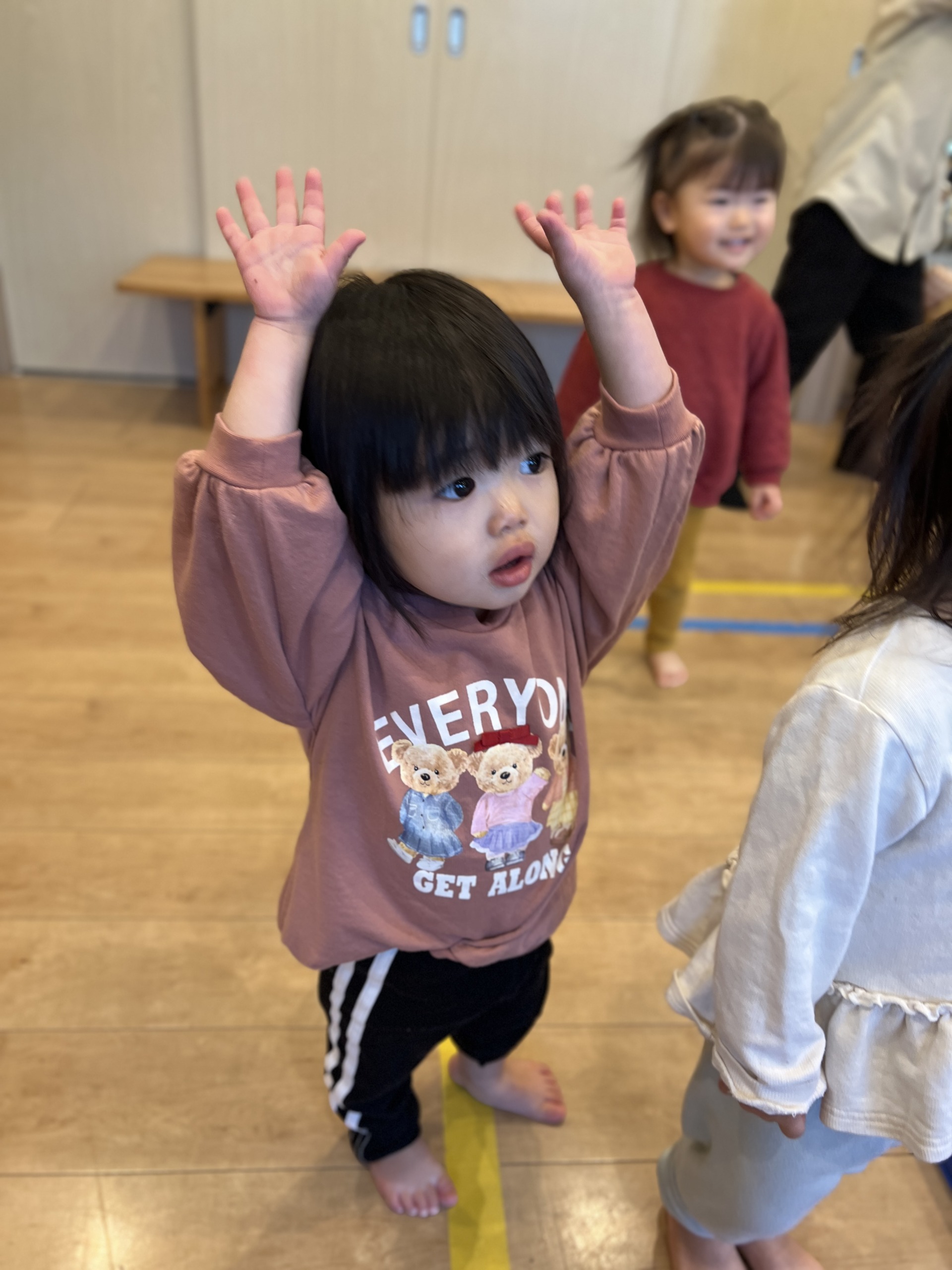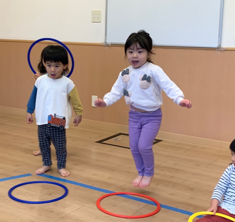 リズムジャンプでは、雪の歌に合わせてまえ、うしろと声を出しながらジャンプしました。