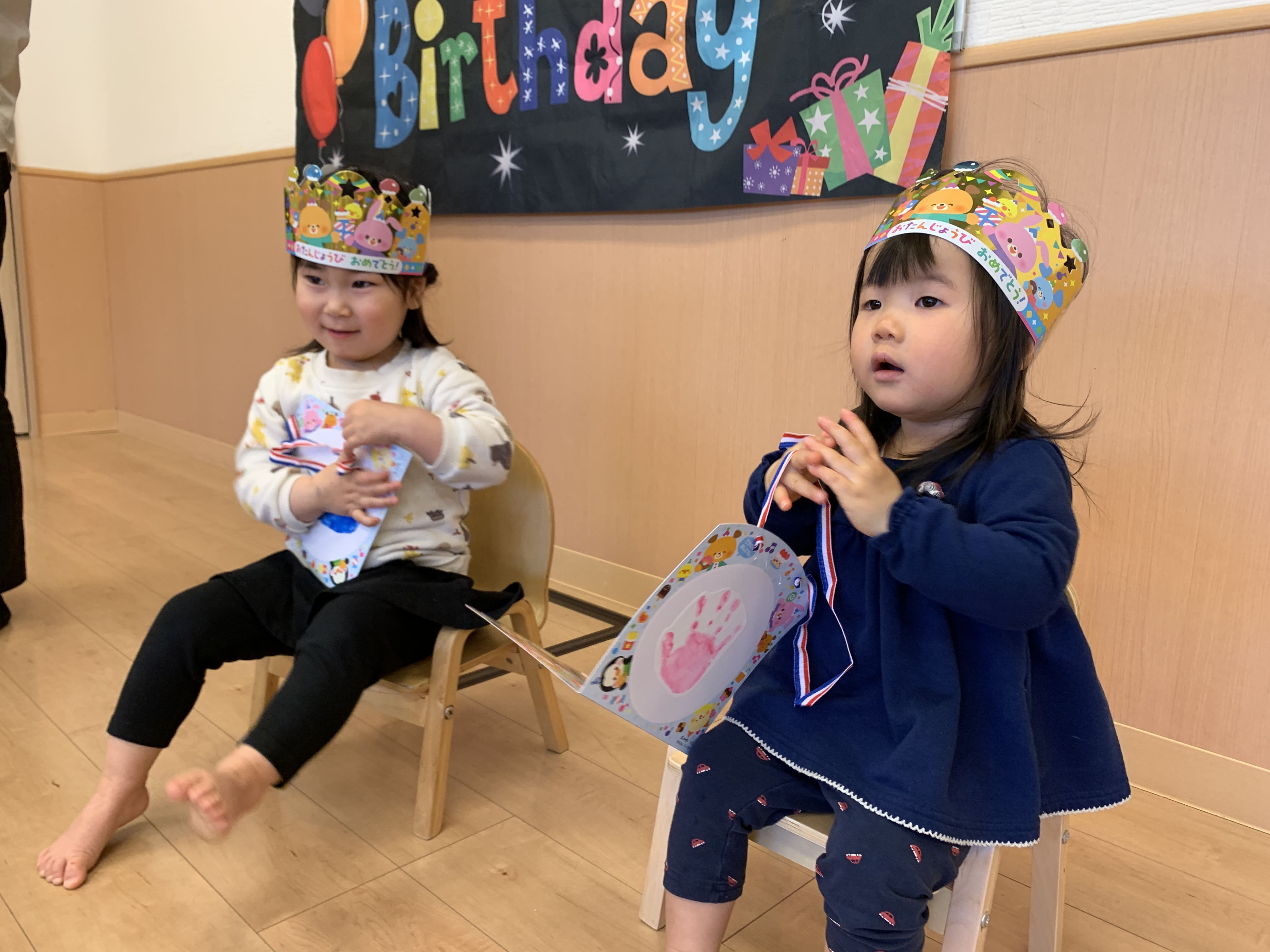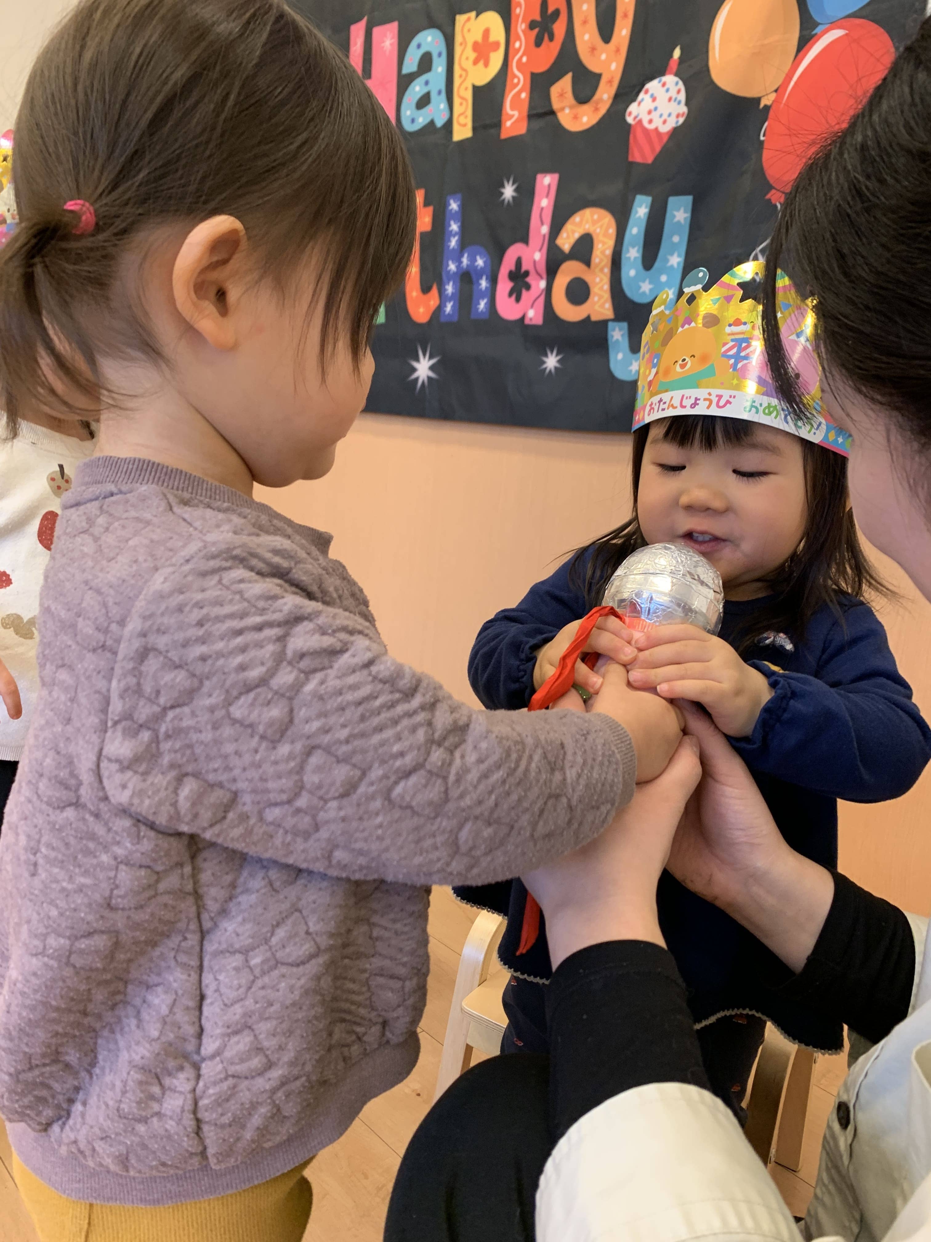 虹組さん(2歳児クラス)の子どもたちは「ハッピーバースデイ!」と元気いっぱいに歌い出したり、