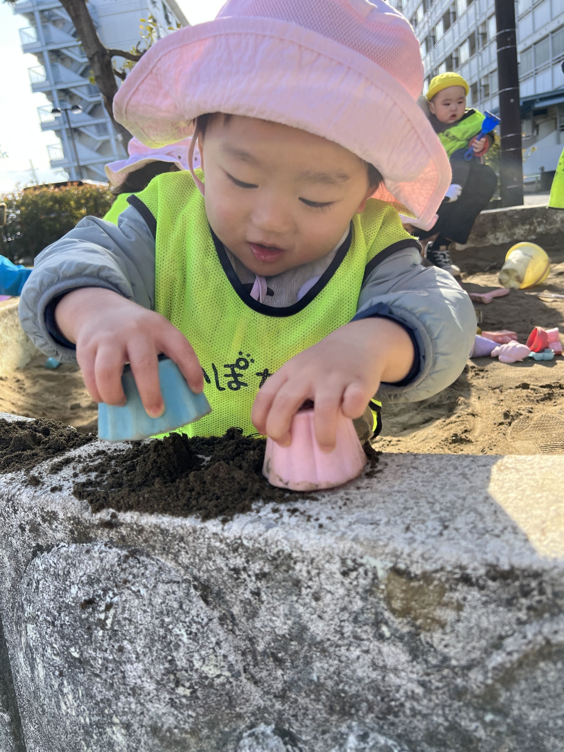 シャベルで砂をすくったり、型抜きで形を作ったり、夢中になって遊んでいました。