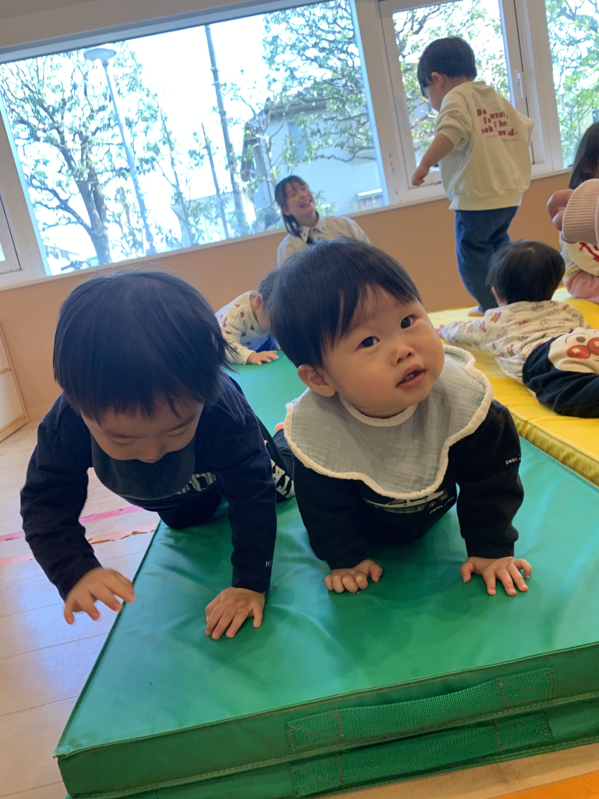 マットの上を「よいしょ、よいしょ」とハイハイで移動する子どもたち。