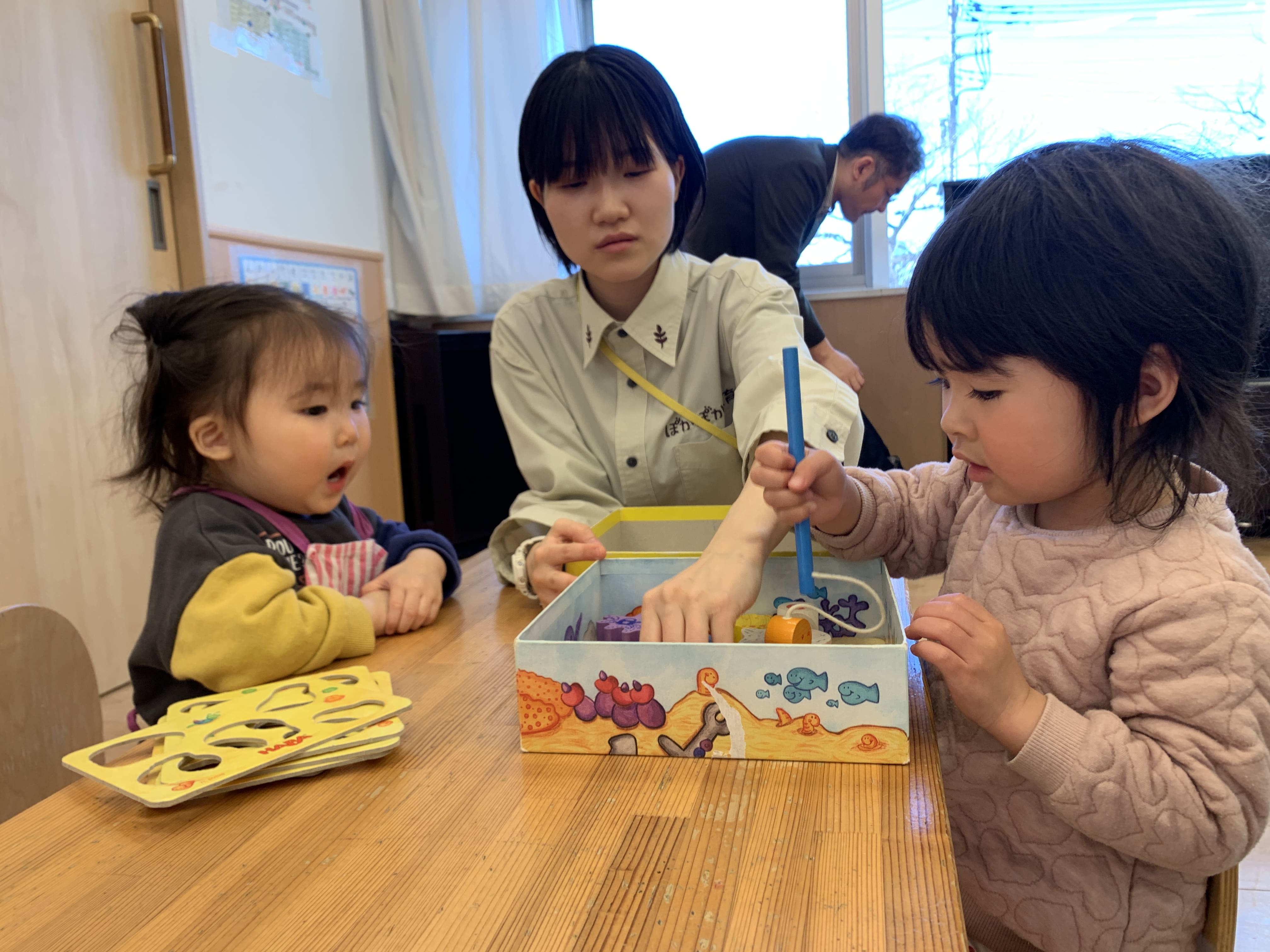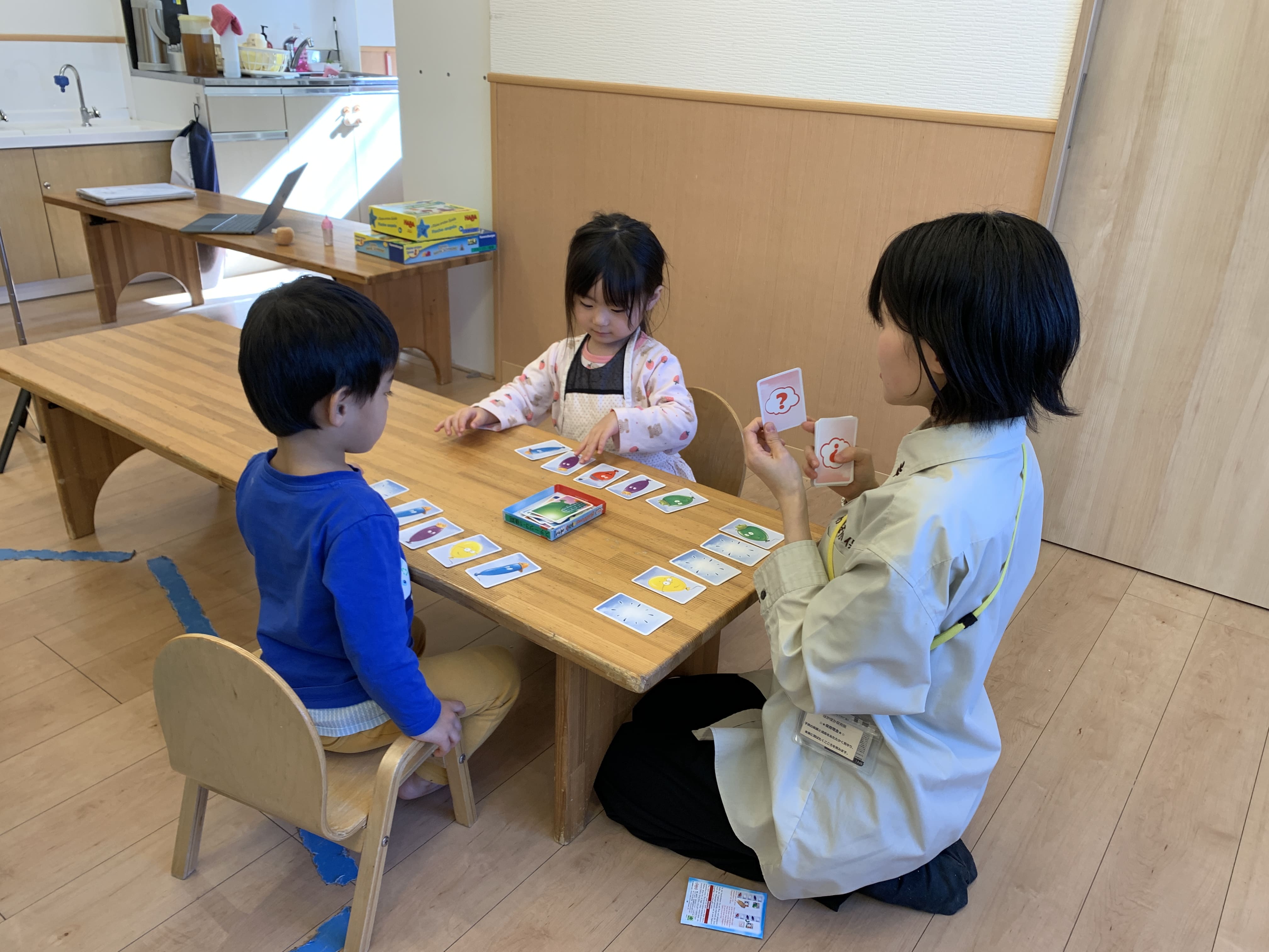 一方、1歳児、2歳児の大きいお友だちは、保育室でグループに分かれてアナログゲームを楽しみました。