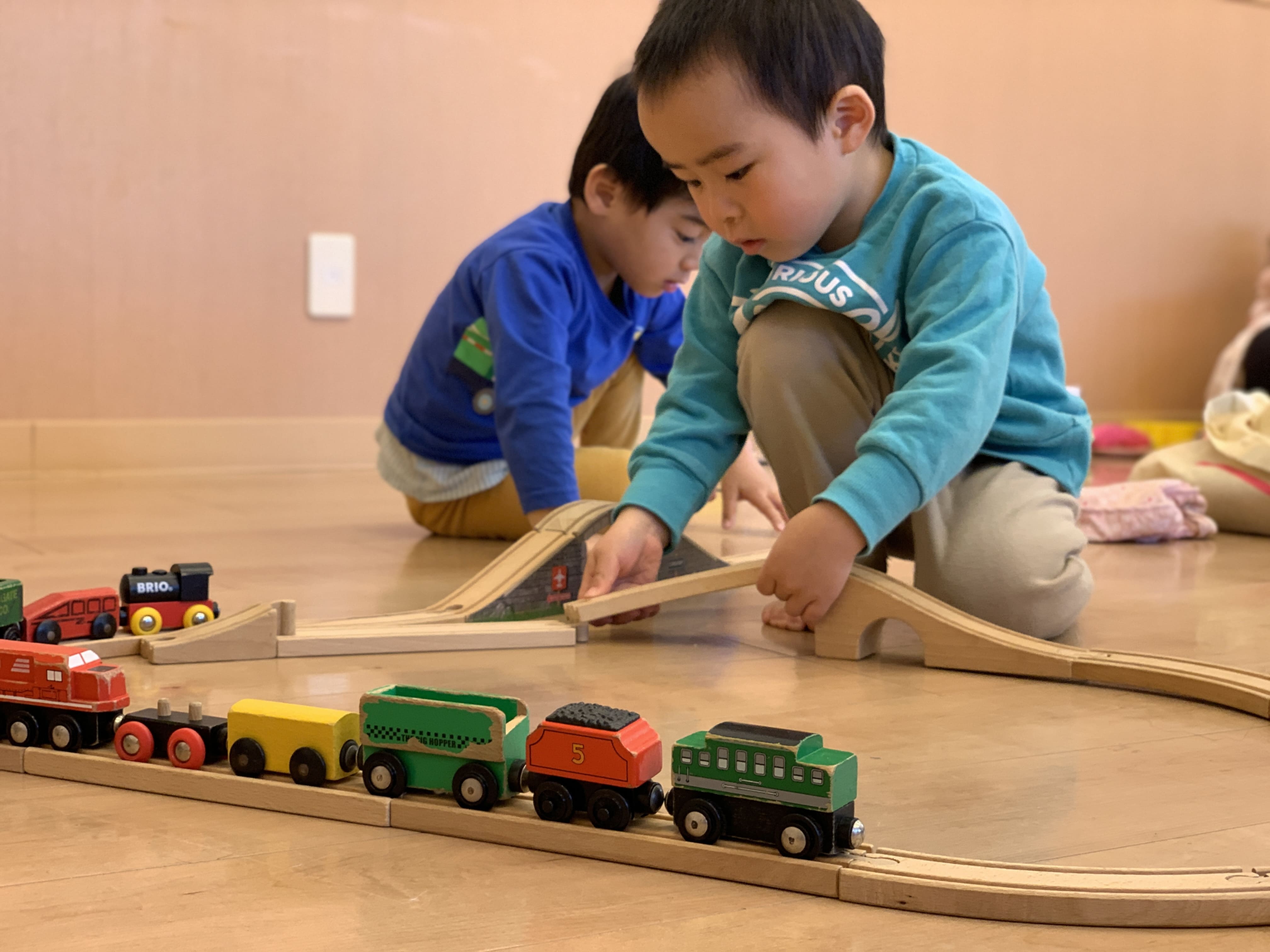 アナログゲームの合間には、おままごとやプラレールで遊びました。