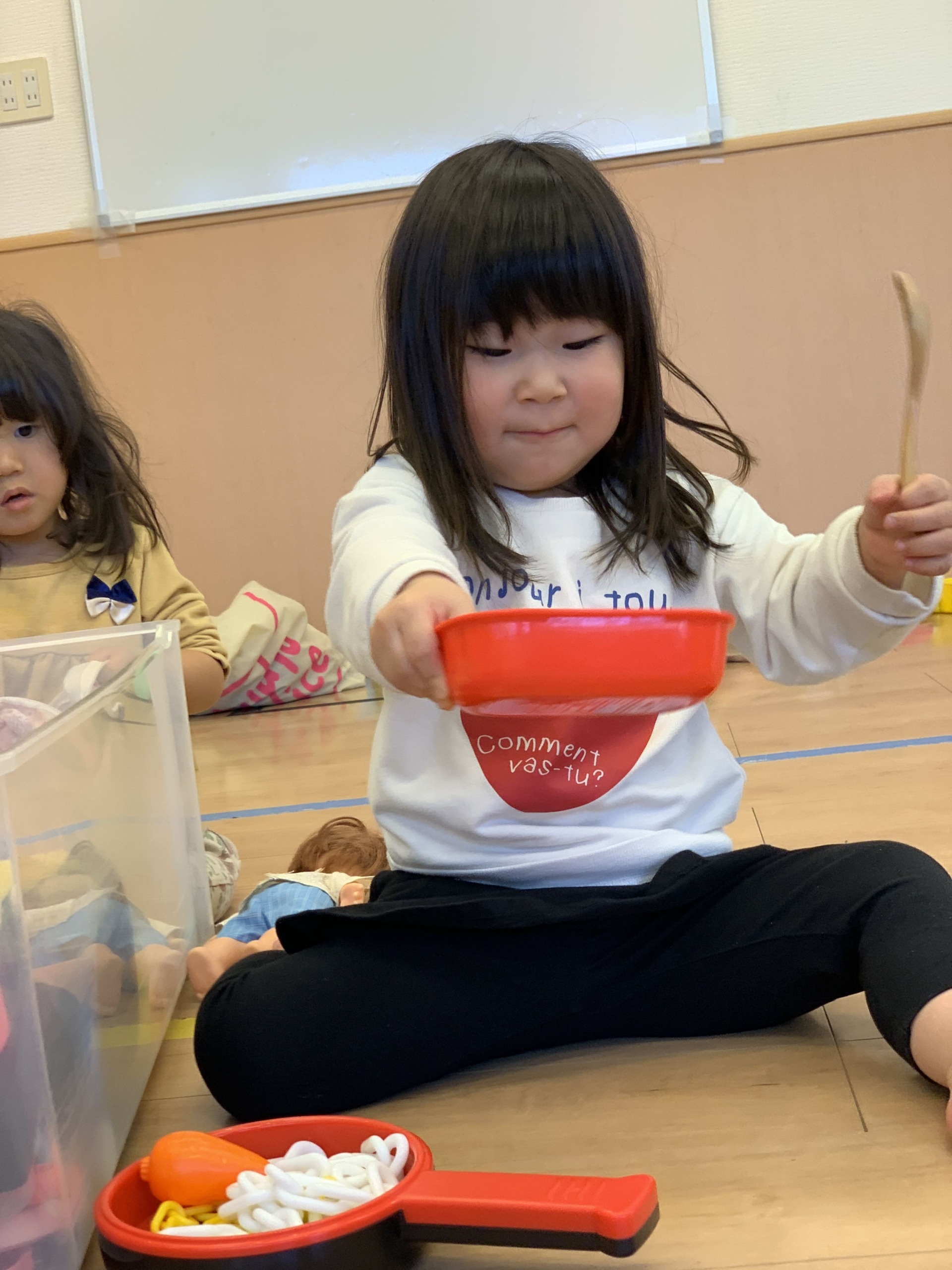 おままごとでは、「いらっしゃいませー」と、お店屋さんごっこが始まり、