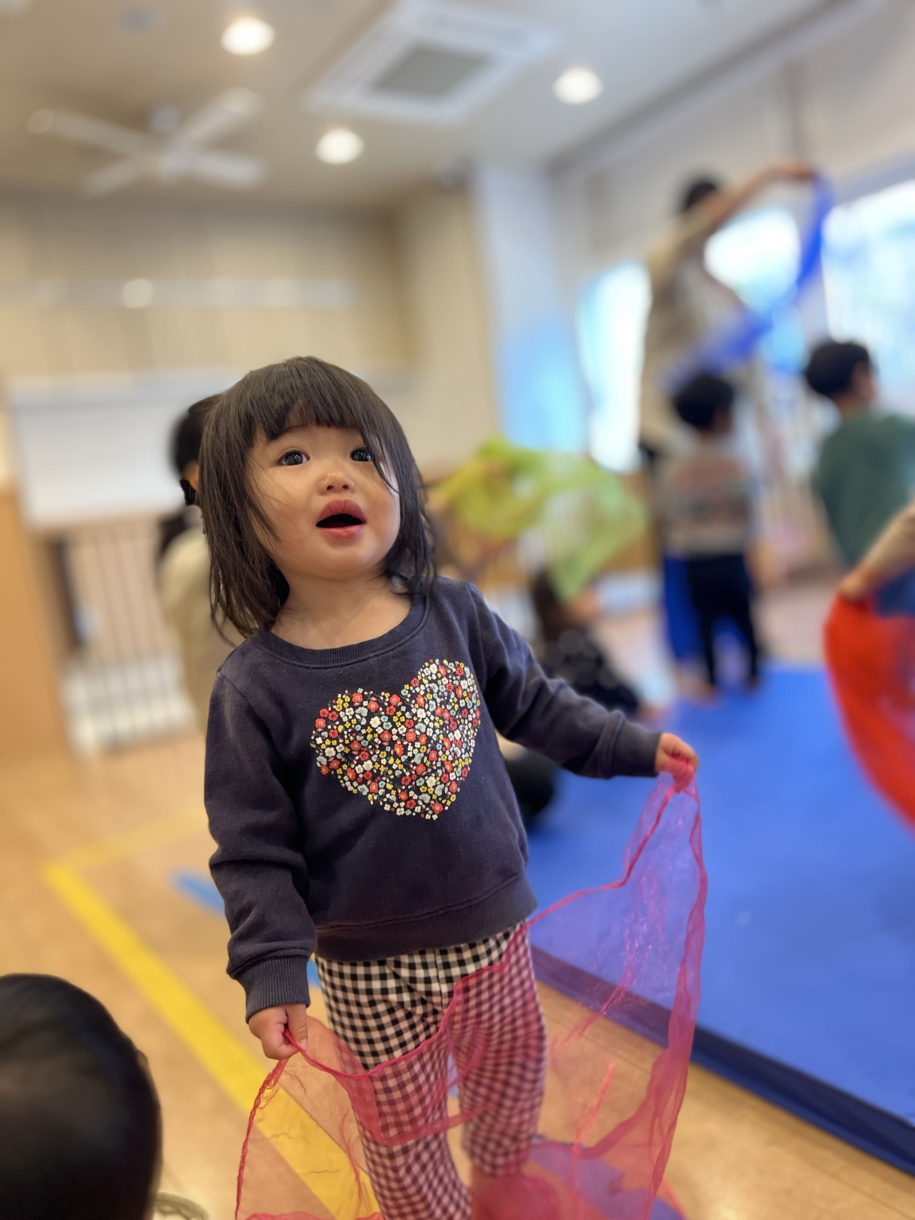 先生が「キラキラのスカーフを音楽に合わせて揺らしてみようね」と声をかけると、