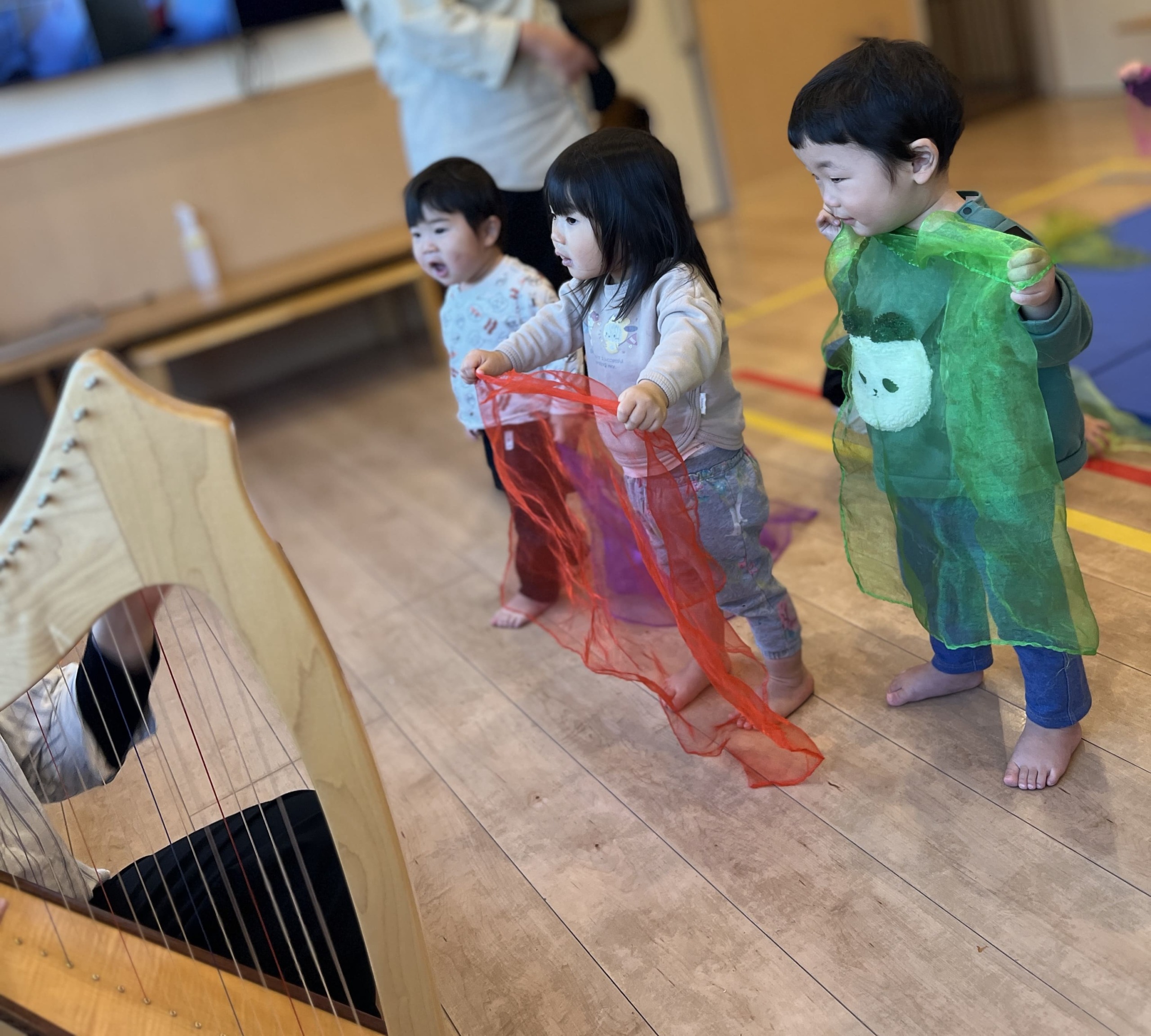 ハープの美しい音色が響き渡ると、子どもたちはじっと耳を傾けていました。