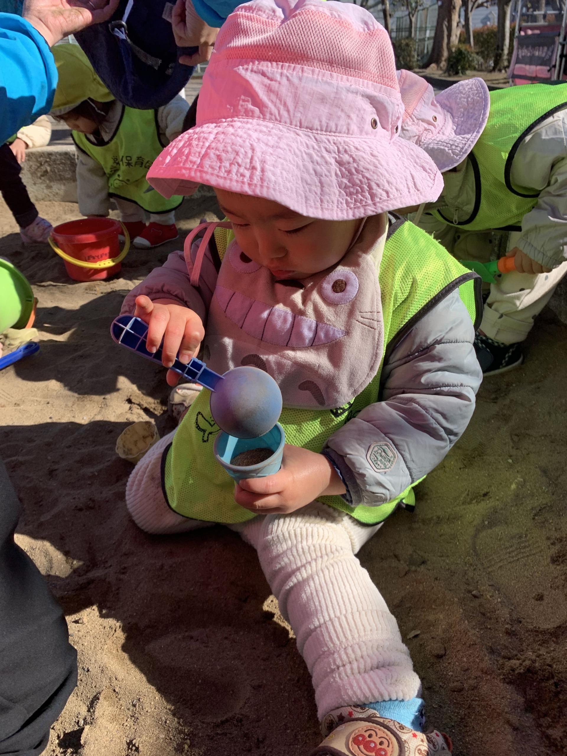 公園の砂場では、お皿に砂を盛り付け、「せんせい、ケーキできたよ!」と、
