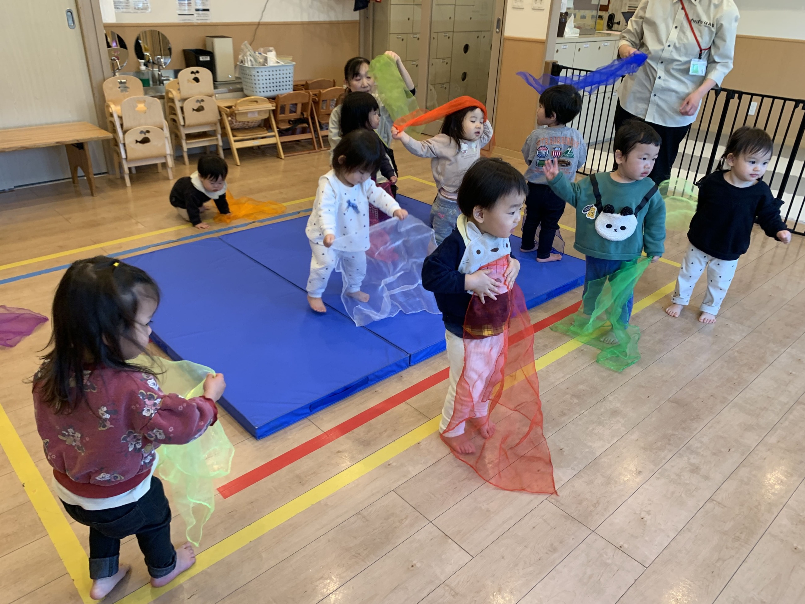 先生が「キラキラのスカーフを音楽に合わせて揺らしてみようね」と声をかけると、