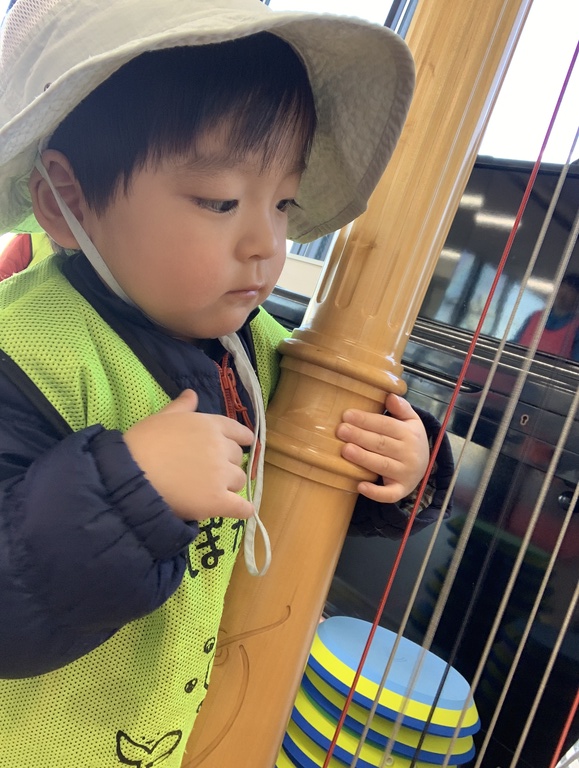 一方、1、2歳児の大きいお友だちは、本園でハープの音楽遊びに参加しました。