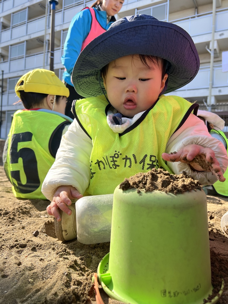 砂を握ったり、指の間から落としたりして、感触遊びに夢中になっていました。