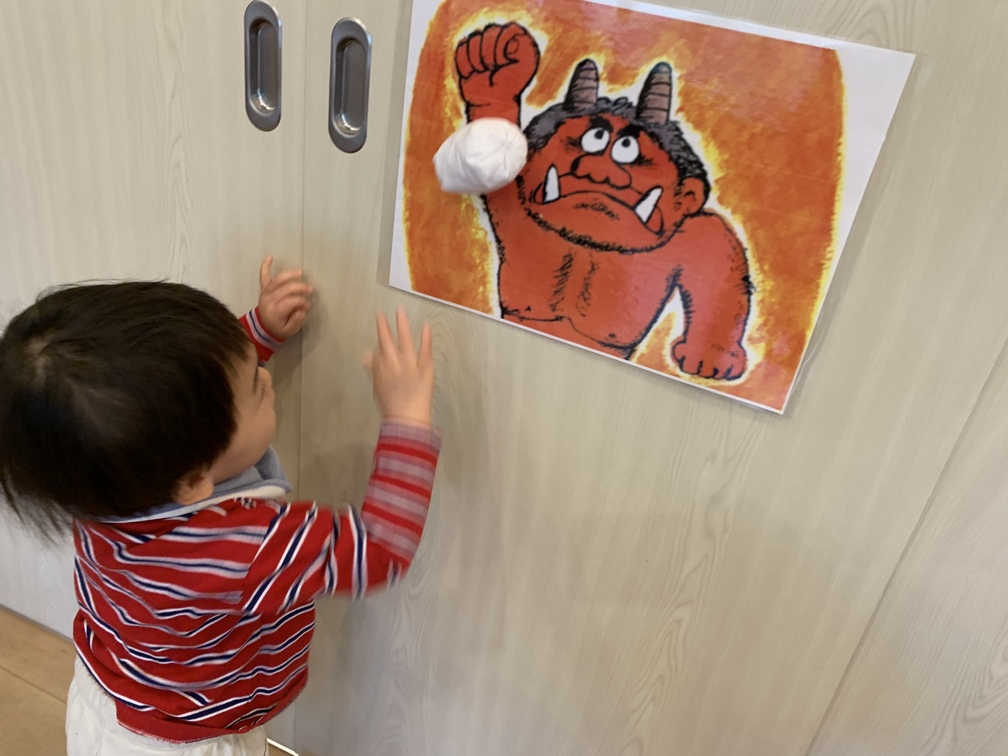 節分が近いので、鬼の絵をめがけて玉を投げる「鬼退治ゲーム」をしました。