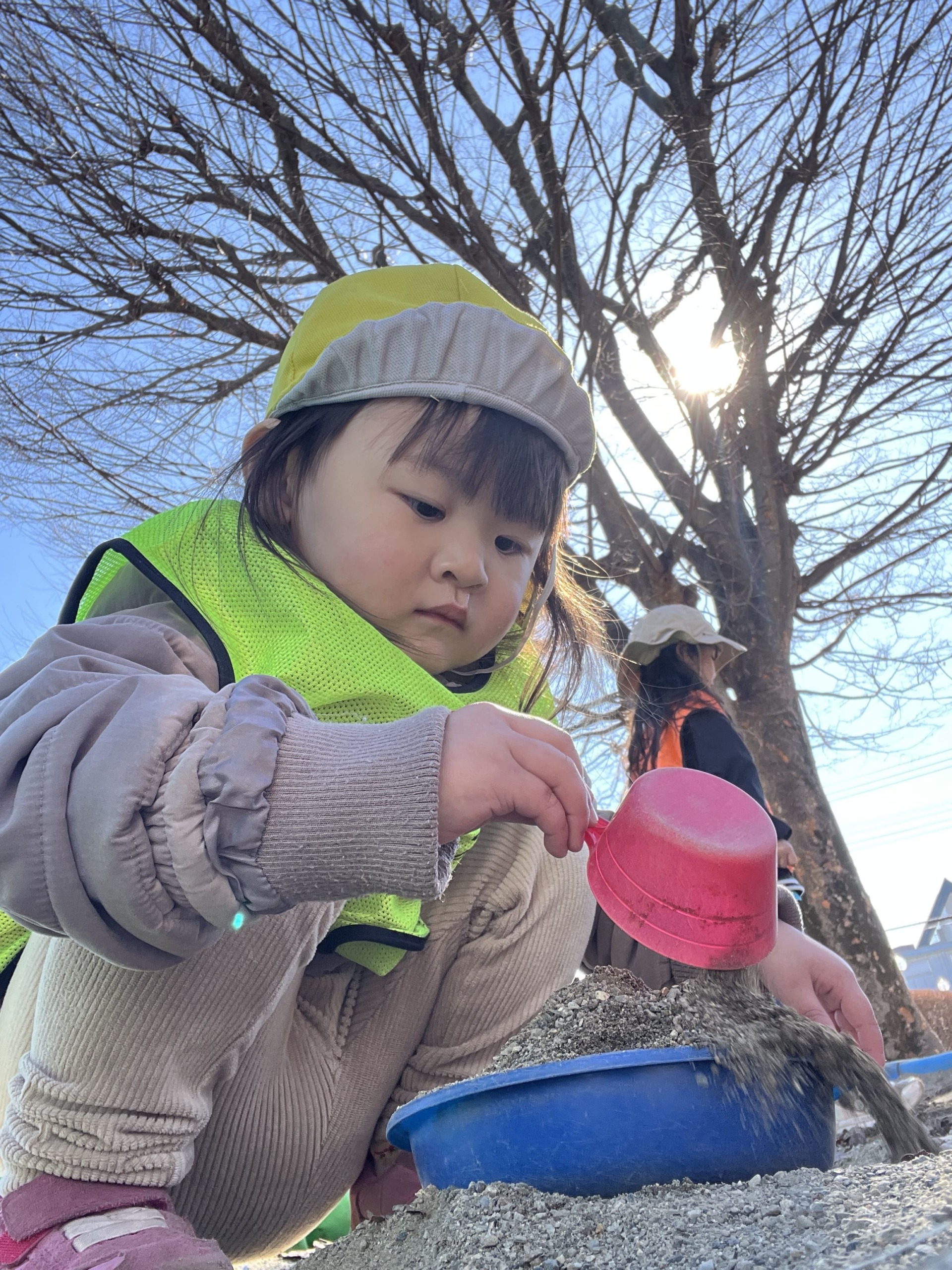 子どもたちは小さなスコップやカップを手に、真剣な表情で砂と向き合い始めました。