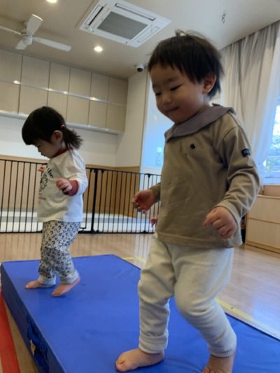 子どもたちは、小さな手足を使って一生懸命マットを乗り越えていましたよ。