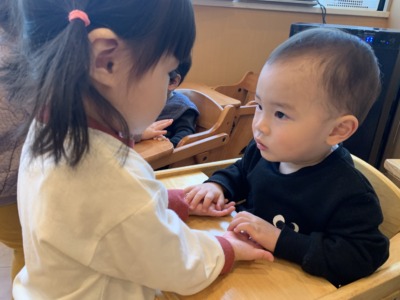 今日は、小さいクラスのお友達と大きいクラスのお友達が、それぞれの場所で楽しい活動に取り組みました。