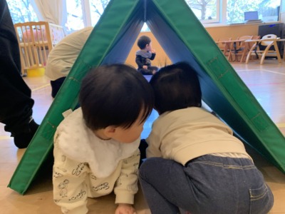 子どもたちは、しゃがんでハイハイをしながらトンネルをくぐり、