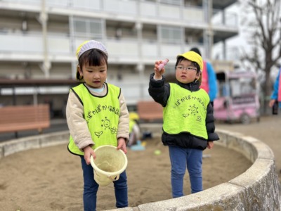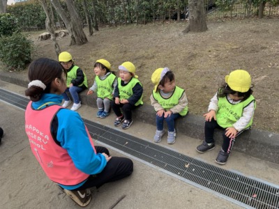 今日は、1歳児と2歳児の子どもたちが合同で、近くの公園に遊びに行きました。