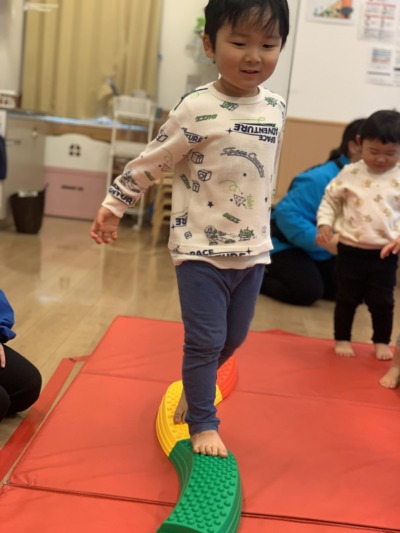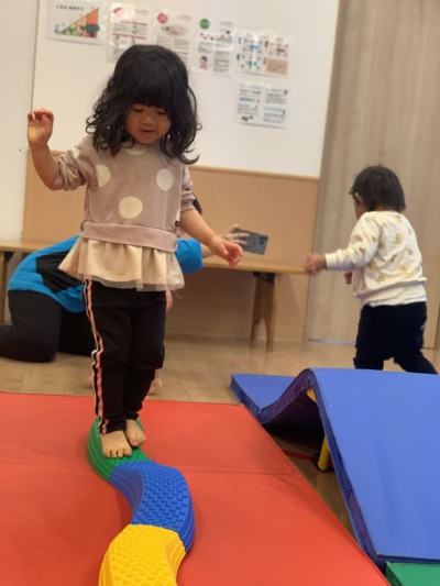 バランスブロックの上を、落ちないようにそーっと歩いてみたり、
