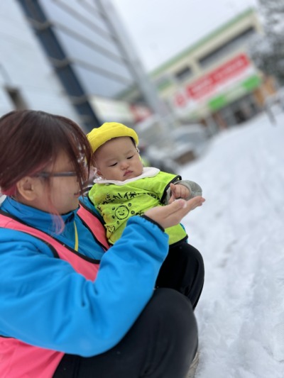 冷たい雪をそーっと触っては、「つめたーい!」と、顔を見合わせてにっこり。