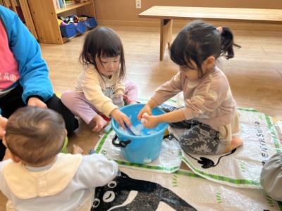子どもたちは夢中になり、タライの周りに集まって集中して遊び始めました。