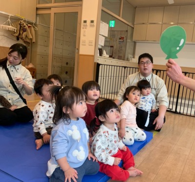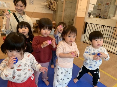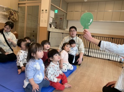 ふうせんのペープサートで色を意識し、物と結び付けて認識を促します♪