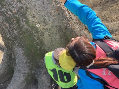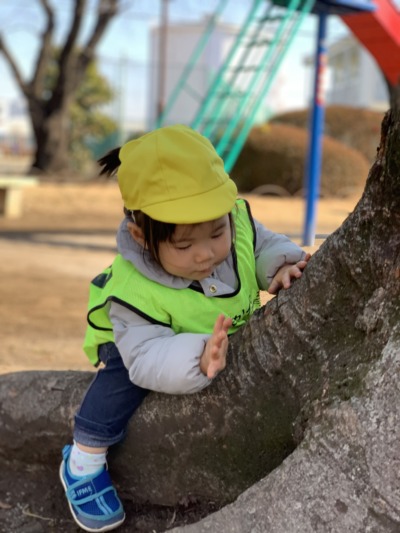 「おっきな木だね!」と、幹を触ってみたり、根っこを「よいしょ!」と跨いでみたりと、全身で自然を感じているようでした。