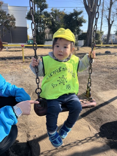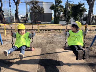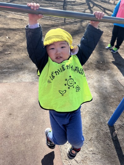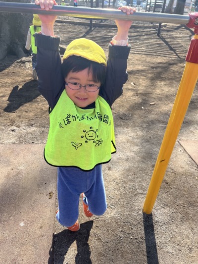 鉄棒にぶら下がってみたり、ブランコに乗って「もっと高く!」と、風を感じたりと、それぞれの好きな遊具を思う存分楽しみました。