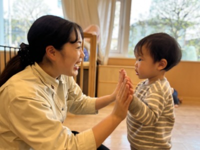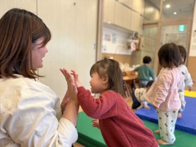 「できたね!」の合図で先生と元気いっぱいにハイタッチ!