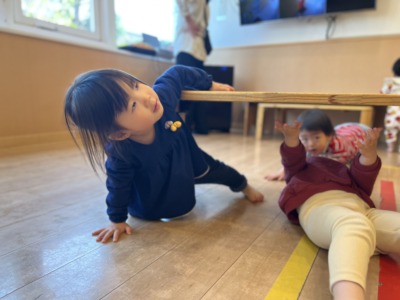 テーブルを机に見立てて、その下を小さな体でくぐり抜けていきます。