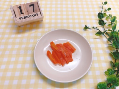 誤嚥防止のため、りんごは皮をむいて小さく切り、蒸し煮に。やさしい甘みとしっとりした食感が好評で、「りんごおいしい!」と大喜び。食後のデザートとして大満足の様子でした。