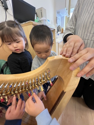 みんなは室内で、ハープの音楽遊びを楽しみました。