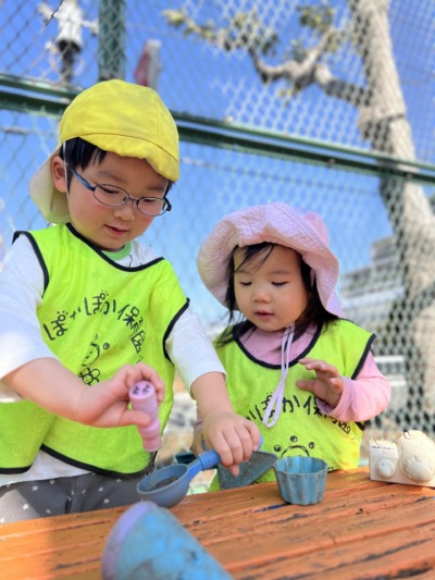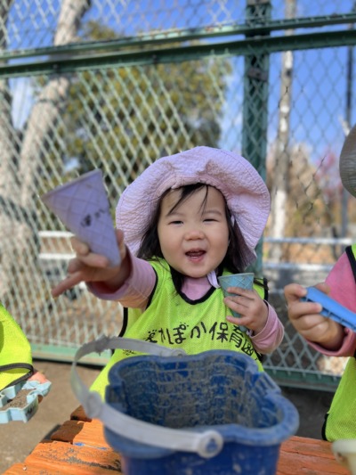 まずは、お砂場セットを使っての「お店屋さんごっこ」です。