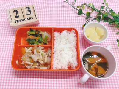 八王子市・日野市で小規模な幼児教育特化の保育園として365日開所、休日保育・病児保育・一時保育にも対応。習い事や手厚い保育で“選ばれる園”をめざし、保活中のママ・パパの育児をサポートする八王子市保育園・日野市保育園の2月23日(月)の給食をご紹介します。YouTube保育園チャンネルで調理の様子も配信中!