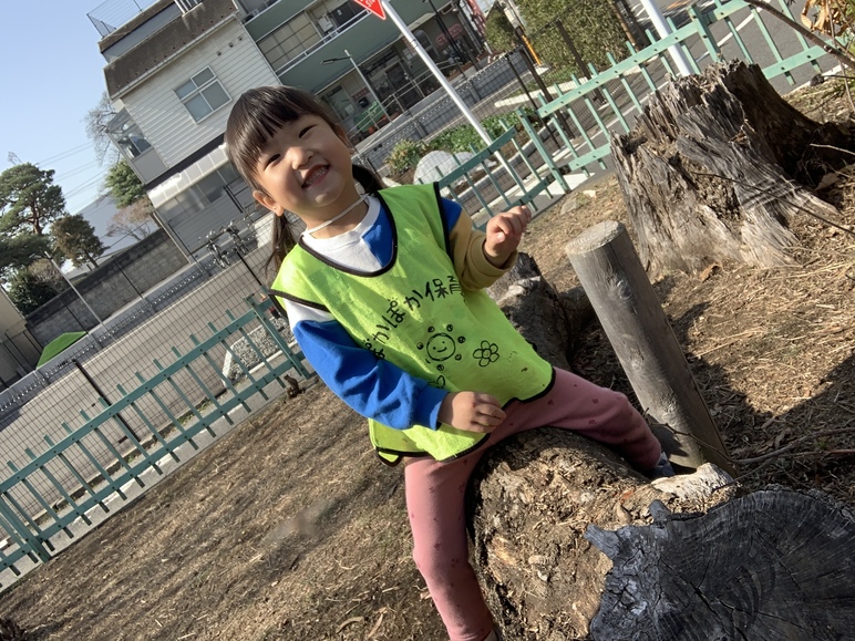 公園に着くと、砂場に座り込んで砂を集めたり、切り株の周りでお店屋さんごっこにチャレンジ。滑り台では先生といないないばあをして、何度も滑って大満喫していました。