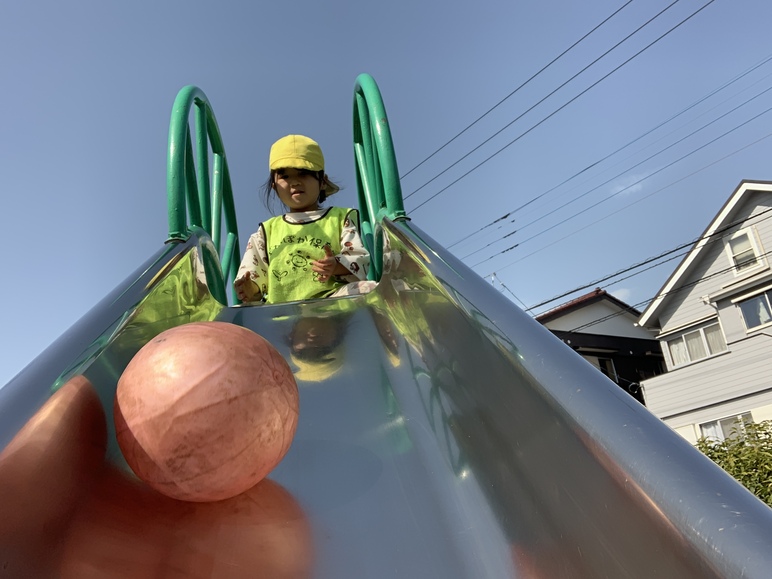 気持ちが切り替わると、滑り台でボールを転がす遊びに夢中に。上から転がしては自分で滑り台を滑り降りる、という繰り返しをニコニコ楽しんでいましたよ。