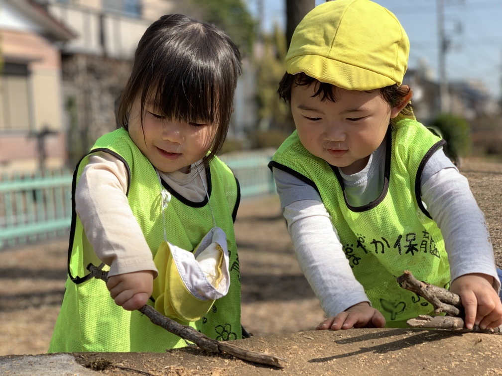 その後も「たんけんにいく?」とおともだちを誘ったり、夢中になって小枝を集めたりと、好奇心いっぱいで動き回っていました。